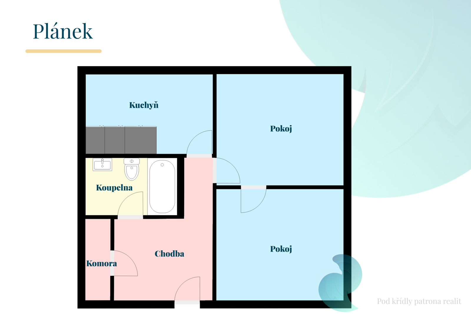 Dispozice nabízí dva samostatné pokoje, kuchyni s jídelním prostorem a dostatek místa pro chytré úložné řešení.