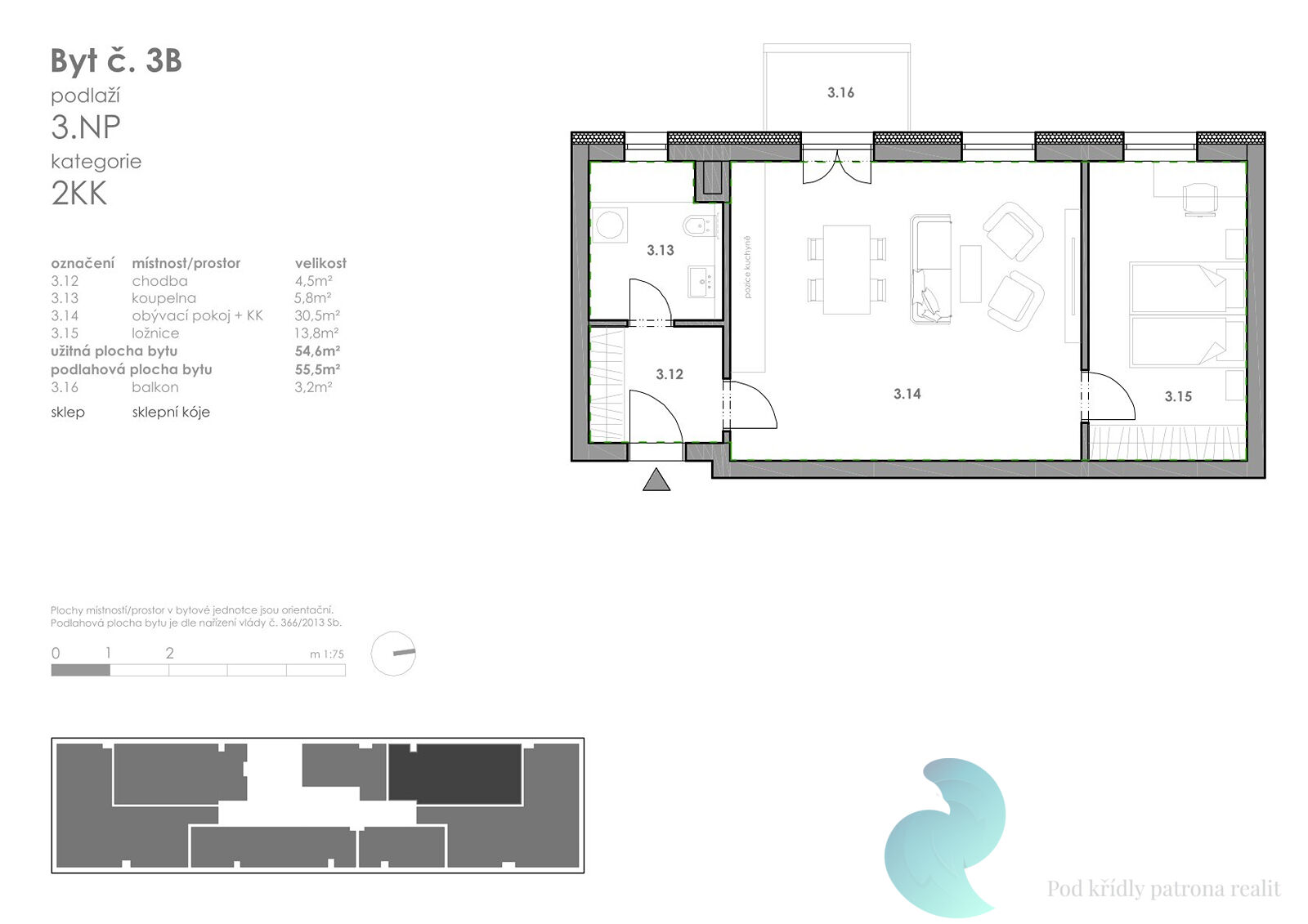 Nabízený byt č. B-3B o dispozici 2+kk, výměře 53,11 m2 s balkonem 3,2 m2, se nachází v třetím patře budovy B. Disponuje vstupní chodbou, obývacím pokojem s kuchyňským koutem, koupelnou a toaletou.