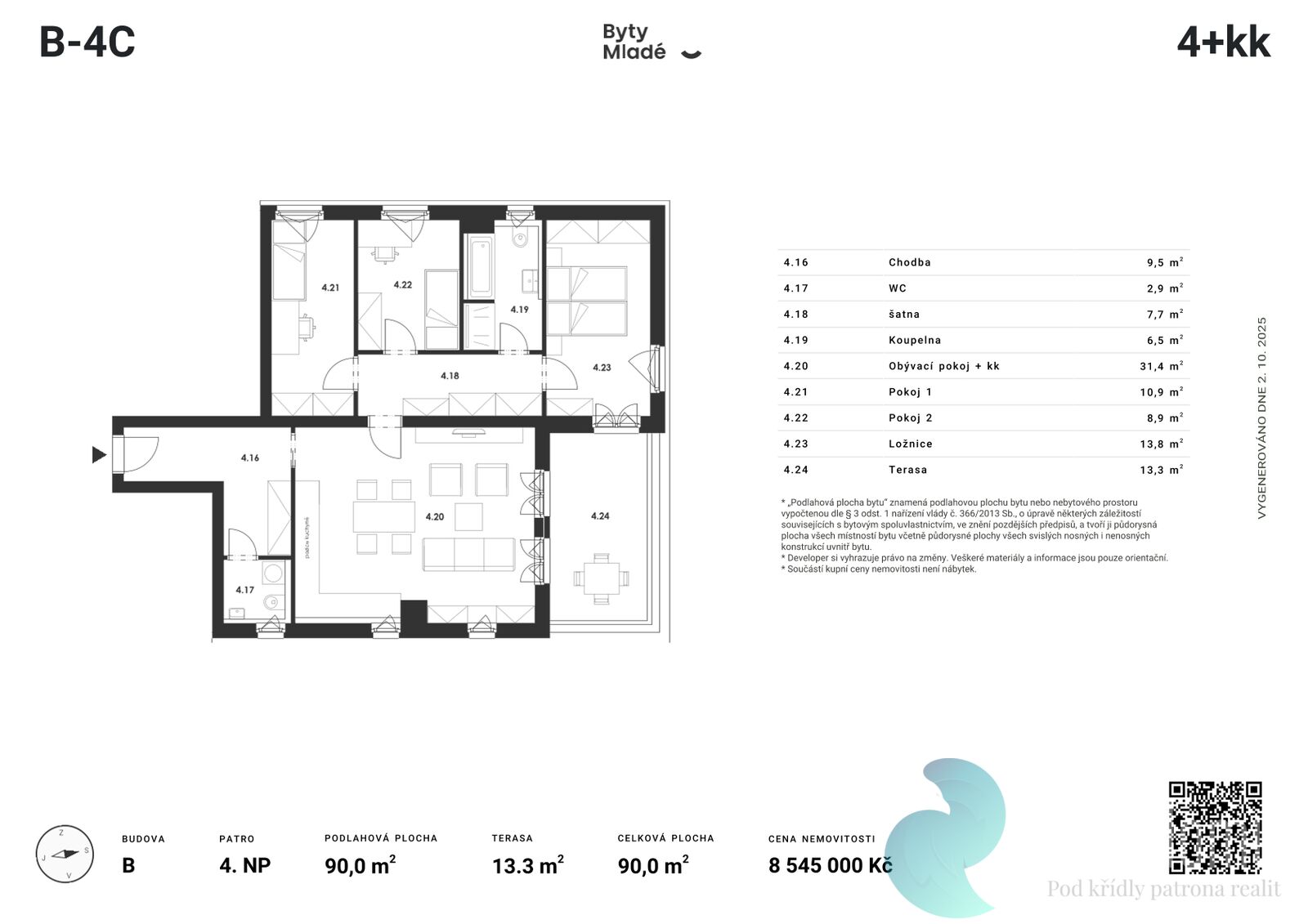 Nabízený byt č. B-4C o dispozici 4+kk, výměře 90 m2 a lodžií 13,3 m2, se nachází ve třetím patře budovy B. Disponuje vstupní chodbou, koupelnou, obývacím pokojem s kuchyňským koutem, neprůchozím pokojem, samostatnou toaletou a ložnicí.