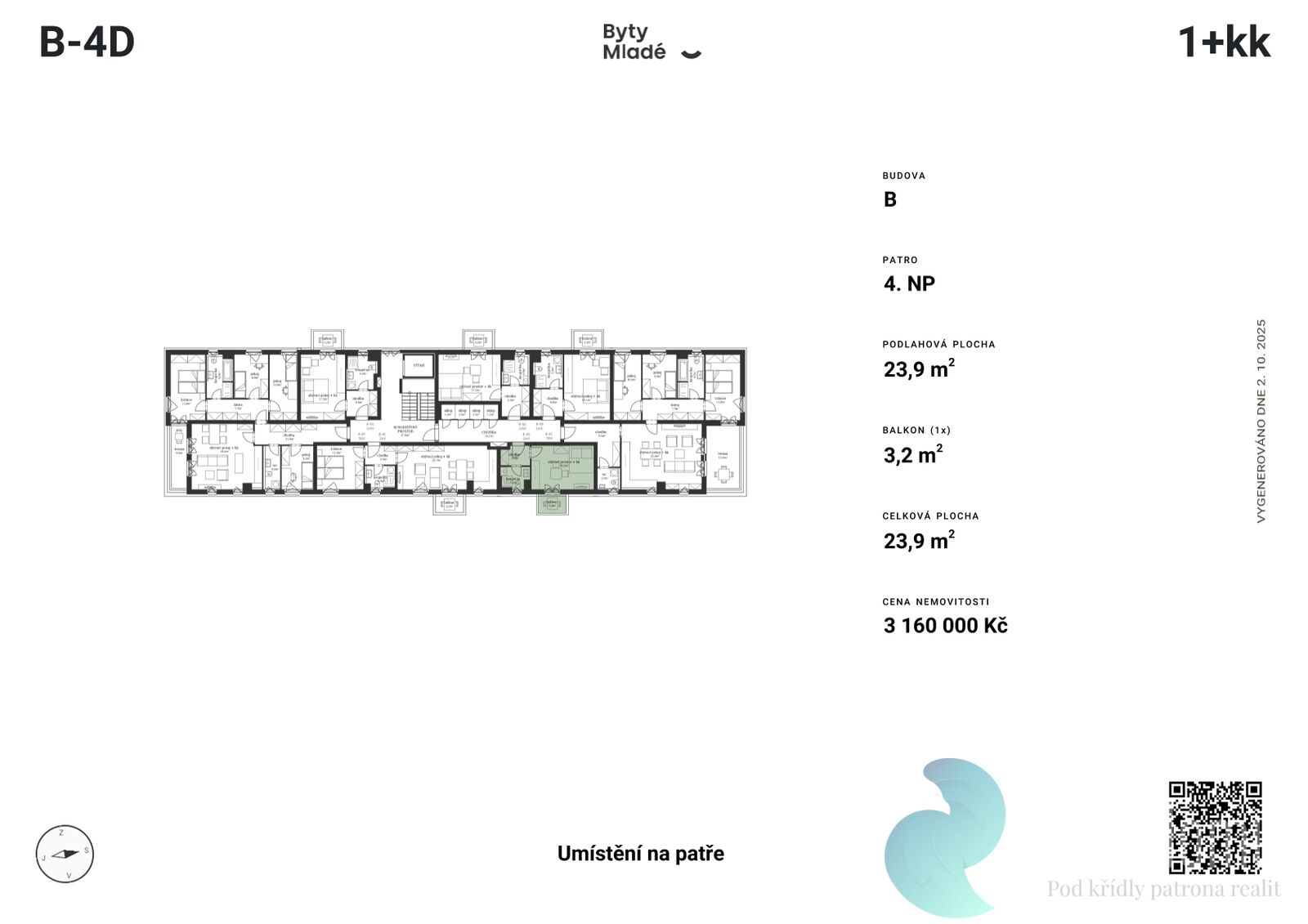Nabízený byt č. B-4D o dispozici 1+kk, výměře 23,9 m2 a balkonem 3,2 m2, se nachází ve třetím patře budovy B. Disponuje vstupní chodbou, koupelnou a obývacím pokojem s kuchyňským koutem.