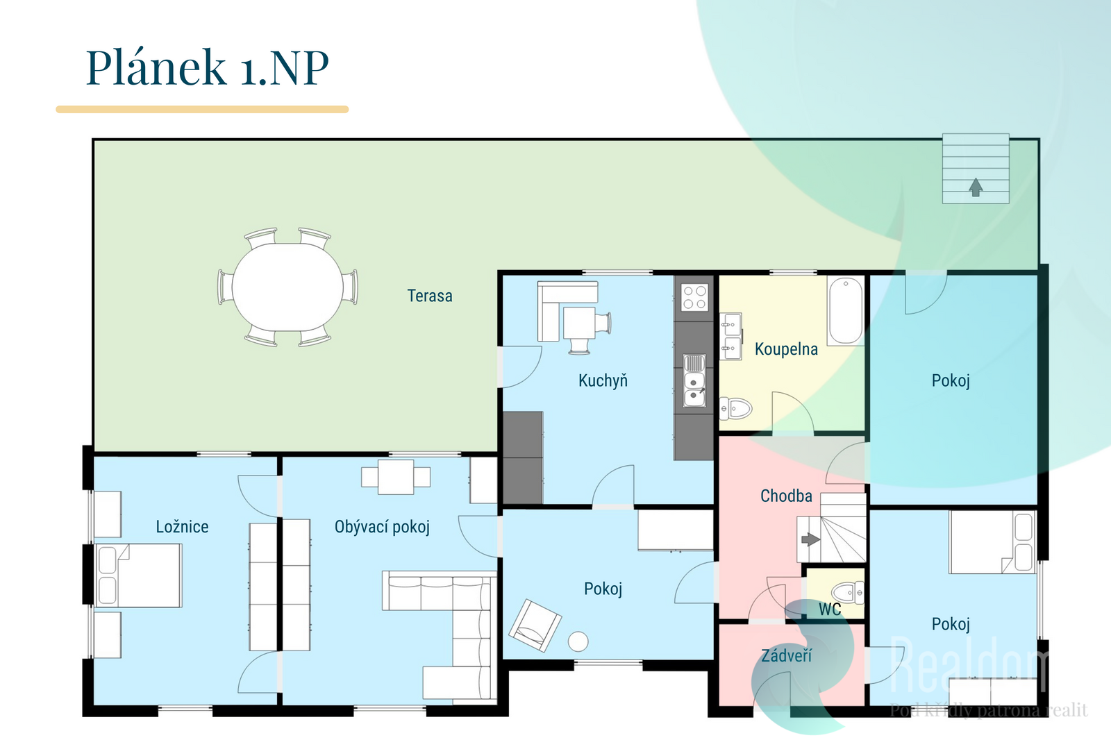 Prostorná terasa v přízemí a menší terasa do zahrady