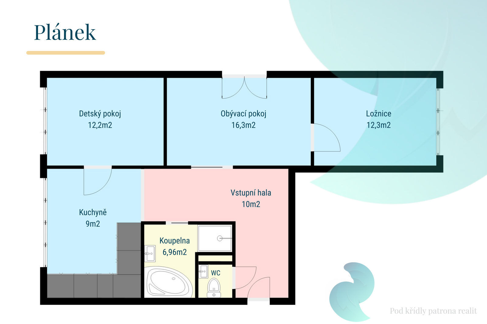 Dispozice bytu je velmi prakticky řešena - z velkorysé vstupní haly (10 m²) vcházíme do obývacího pokoje (16,3 m²) s velkým francouzským oknem, ze kterého je nádherný výhled. Obývací pokoj sousedí s jednou z ložnic (12,3 m²), druhá ložnice/dětský pokoj (12,2 m²) se nachází vedle kuchyně (9 m²). V bytě je krásná koupelna a samostatné WC. Byt je orientován na tři světové strany, což zajišťuje dostatek denního světla po celý den.