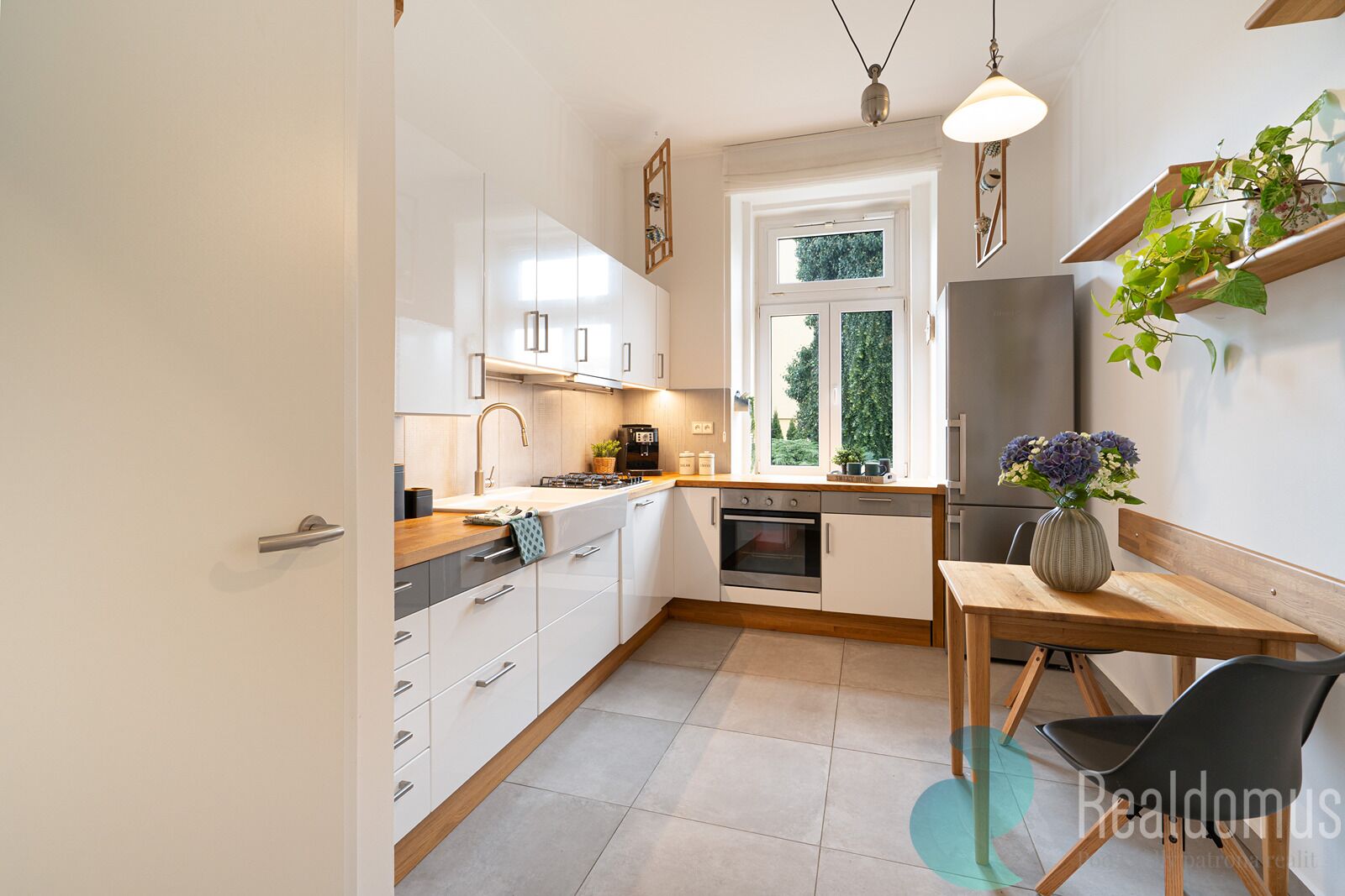 Zděný dům se zahradou a pouze 10 bytovými jednotkami prošel rekonstrukcí, stejně tak jako byt samotný, který byl kompletně rekonstruován v roce 2018. Byt najdeme ve zvýšeném přízemí a patří k němu velký sklepní prostor( 24,6 m2) a podíl na zahradě, která dodává bytu ještě další rozměr.