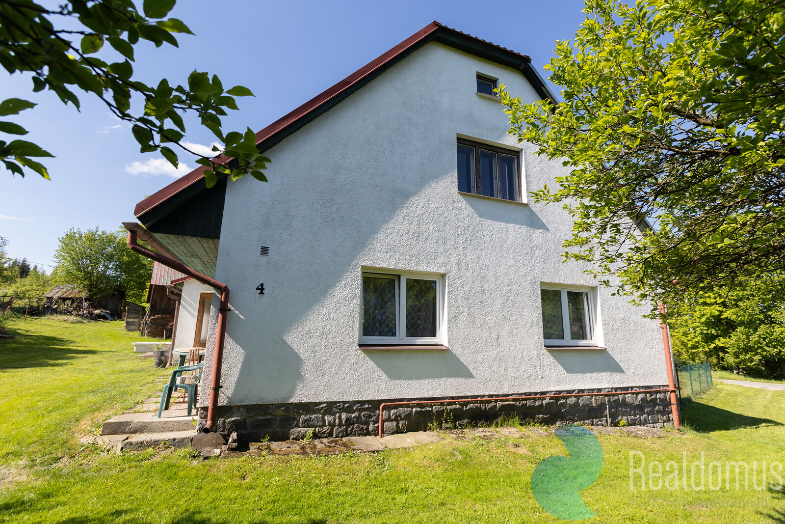 Plynový kotel s radiátory pro vytápění přízemí chalupy, možnost i topení v kamnech. Voda je zajištěna prostřednictvím kopané studny.
