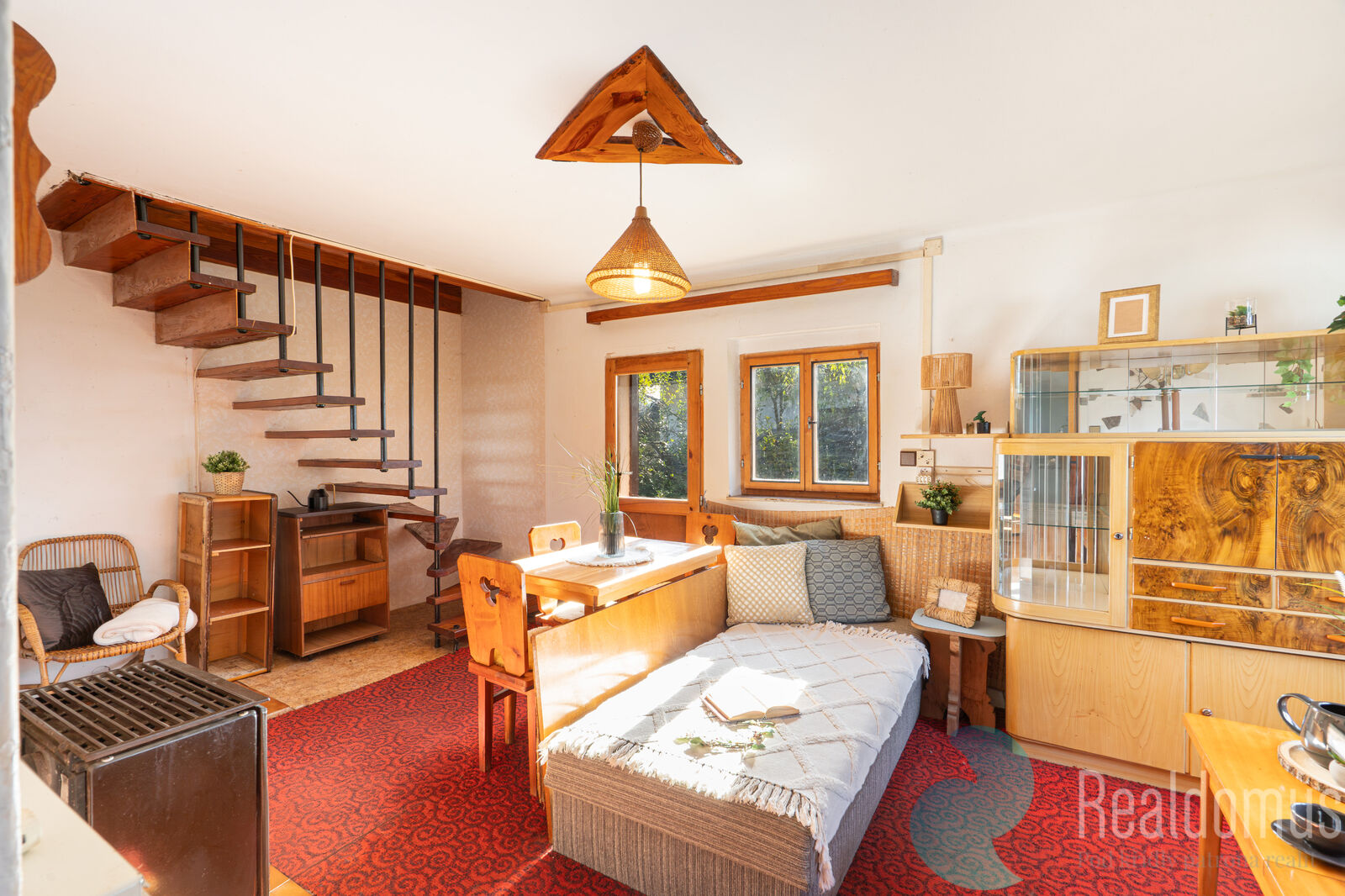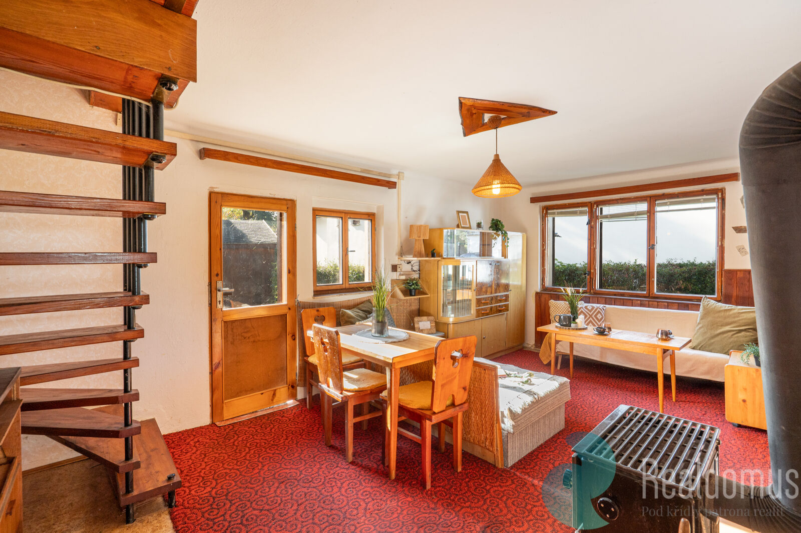 V přízemí se nachází světlý obývací pokoj s kamny, která vytvářejí příjemnou atmosféru a zajišťují teplo. Součástí přízemí je také menší funkční kuchyňka s užitkovou tekoucí vodou a základní sociální zázemí.