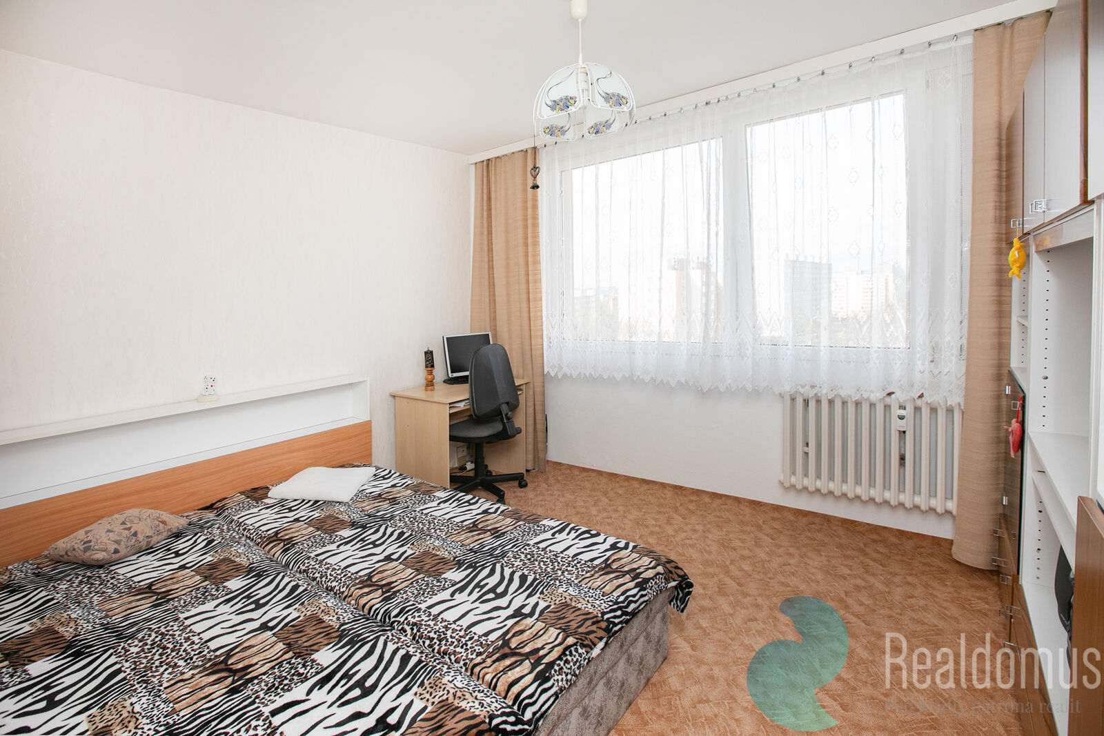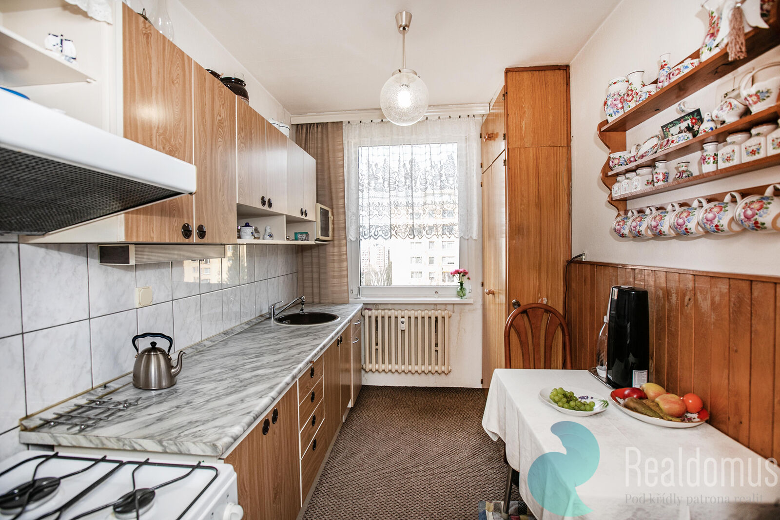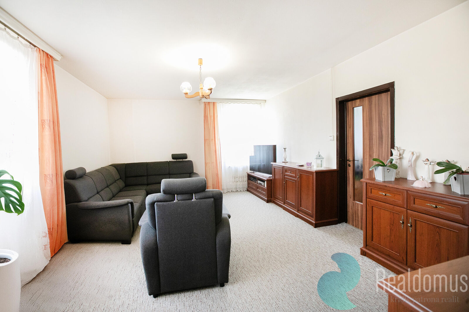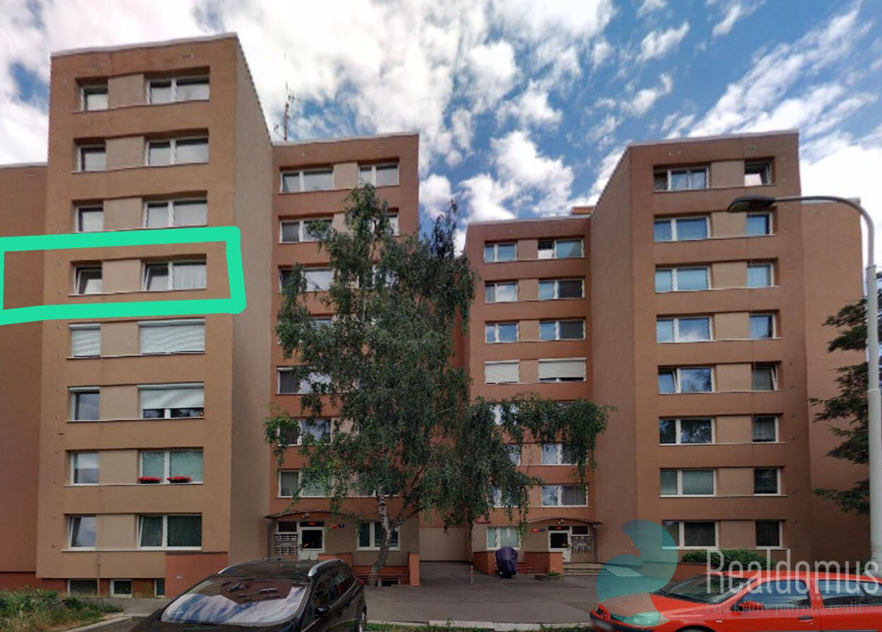 Realdomus zprostředkuje prodej družstevního bytu. Dispozice bytu dva pokoje (12,55 m2 a 12,19 m2), obývací pokoj (23,93 m2), kuchyň (6,53 m2), předsíň (12,38 m2), koupelna (2,90 m2), WC (0,90 m2). Dále k bytu náleží sklep (2,35 m2). Celková plocha bytu včetně sklepa činí 75,71 m2. Kuchyň je vybavena plynovým sporákem a digestoří. Okna jsou plastová s dvojsklem.