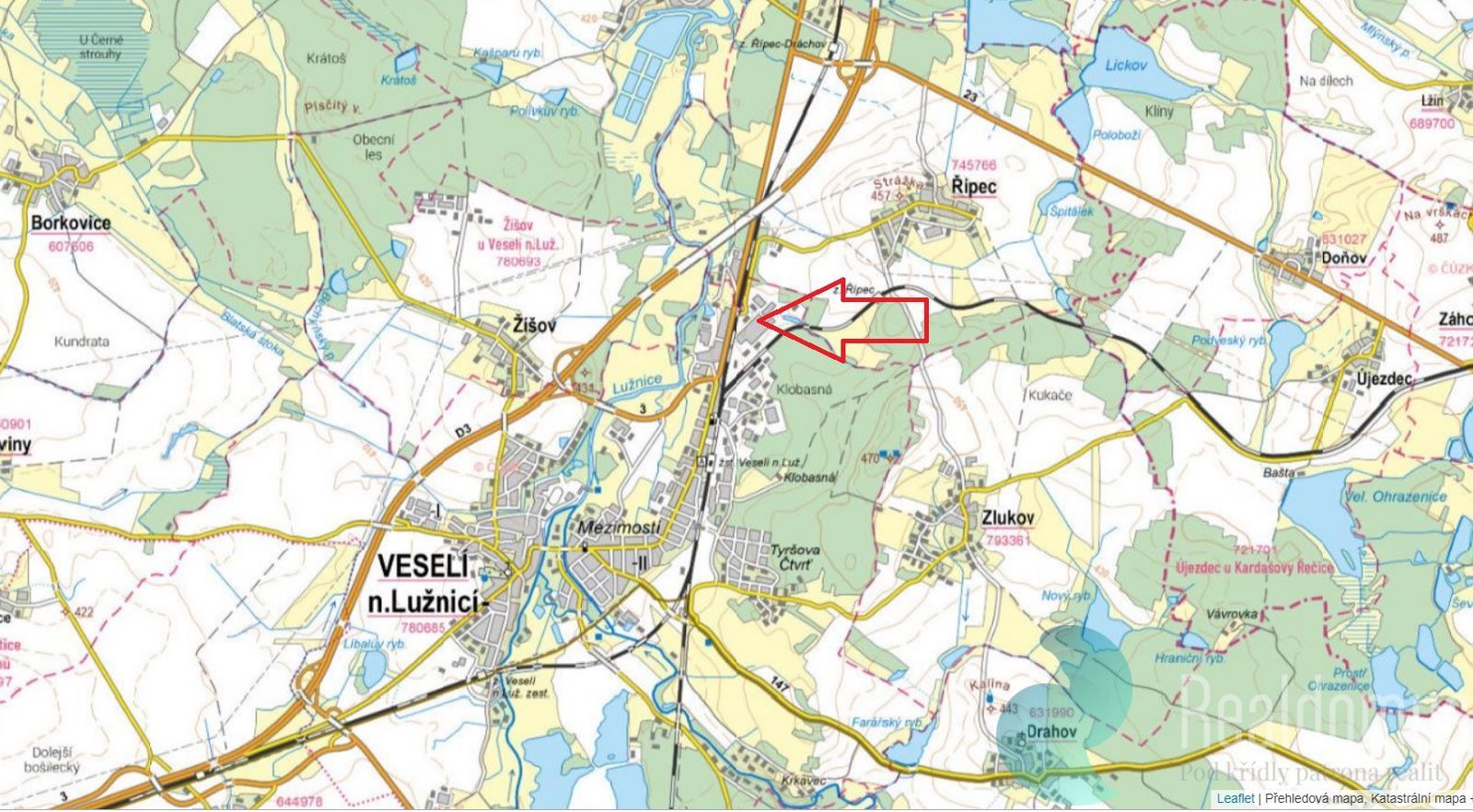 Areál se nachází v severní části obce, na severním okraji průmyslové zóny. Severozápadní okraj lemují plochy zeleně, jihovýchodní část sousedí se stávající průmyslovou zónou. Při západní hranici probíhá komunikace I/3 - Třída Čs. Armády a obslužná komunikace č. 00351 Veselí nad Lužnicí - Řípec. Nájezd na dálnicí D3 je vzdálený 2 km.