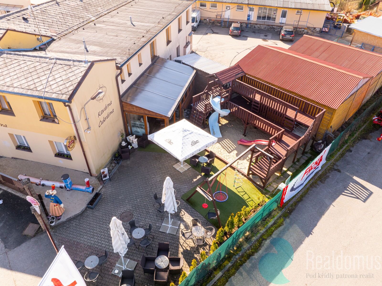 Z celkové plochy je 1 899 m² využíváno jako skladovací, prodejní a kancelářské prostory, 445 m² tvoří byty a 312 m² představují gastro provozy. Oblíbená klimatizovaná kavárna a cukrárna o rozloze 158 m² poskytuje 20 míst uvnitř a 40 míst venkovního sezení, zavedená jídelna o výměře 154 m² nabízí 28 míst uvnitř a 24 míst venkovního sezení. Areál disponuje celkem 26 parkovacími místy.
