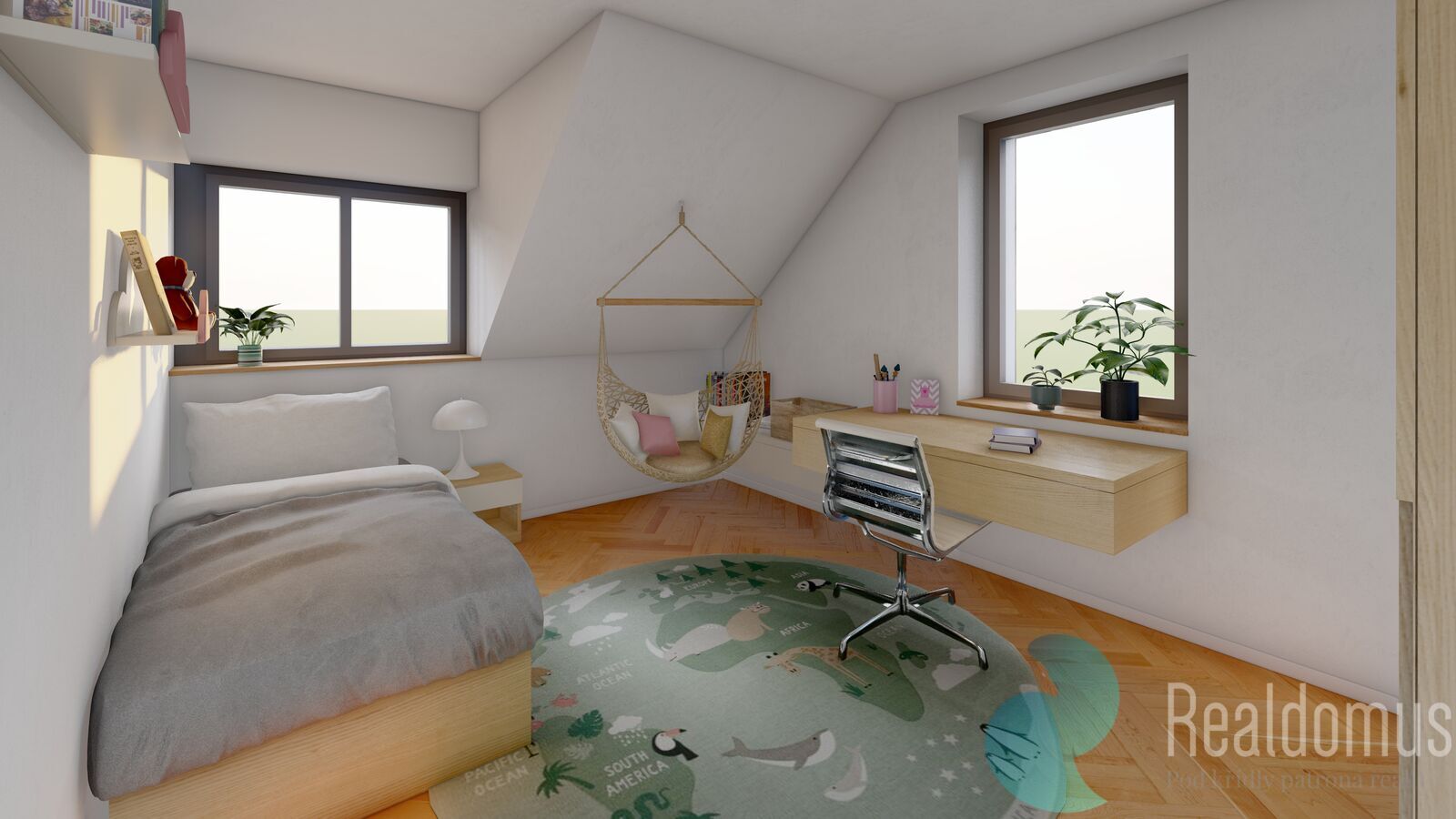 V přízemí domu se nachází prostorný obývací pokoj s kuchyňským koutem a vstupem na terasu, dále samostatné WC, šatna a technická místnost. V patře jsou 3 ložnice a koupelna s WC.