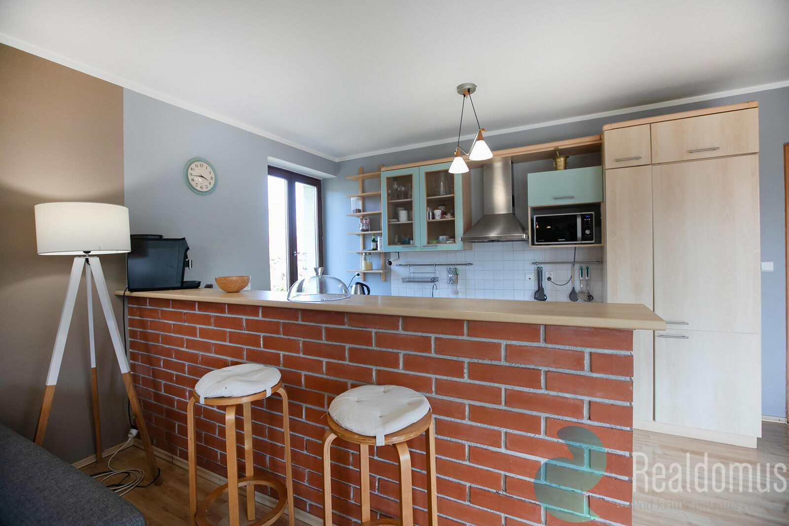 Dominantou přízemí je prostorný obývací pokoj propojený s kuchyňským koutem, odkud vede vstup na slunnou terasu – ideální místo pro ranní kávu či letní grilování. Je možné vybudovat krb, jelikož obývákem prochází komín. Z prostorné haly se dostanete do dvou pokojů, šatny a koupelny s vanou a WC.