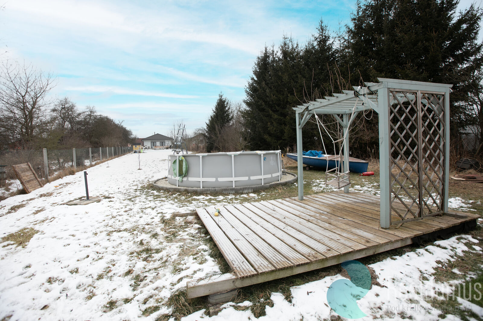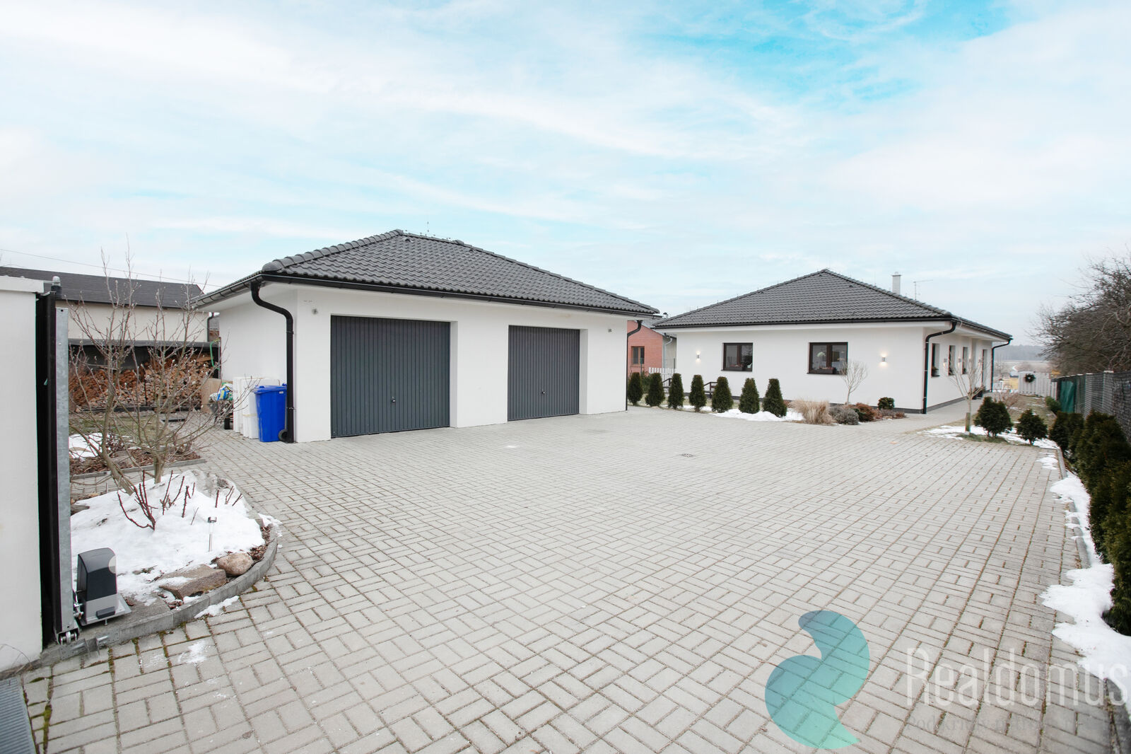 Na pozemku se nachází dvougaráž o velikosti 54 m², ideální nejen pro parkování, ale i jako dílna nebo sklad. Na pozemek se vjíždí přes posuvná vrata. Na druhém konci zahrady se nachází nadzemní bazén.