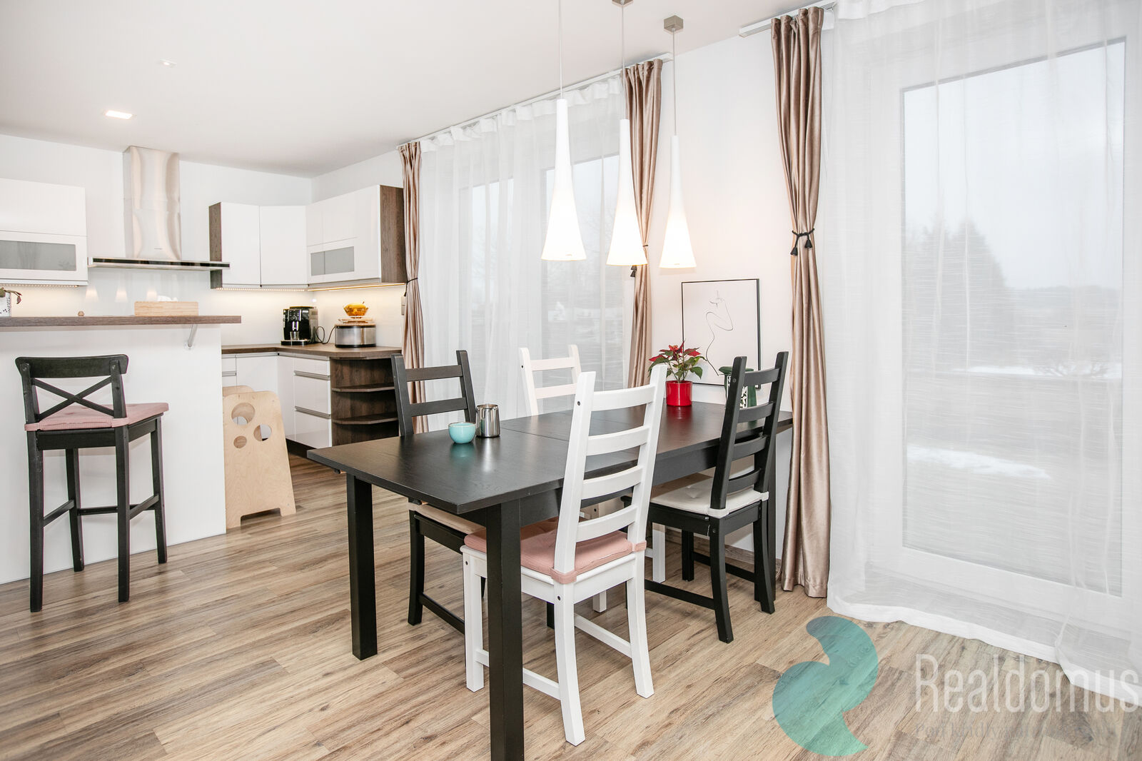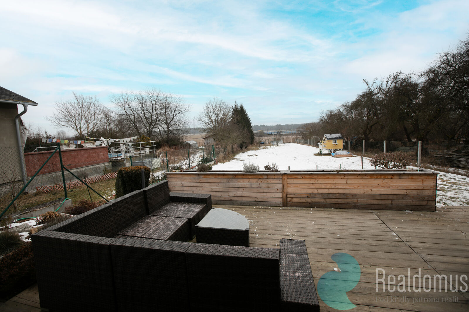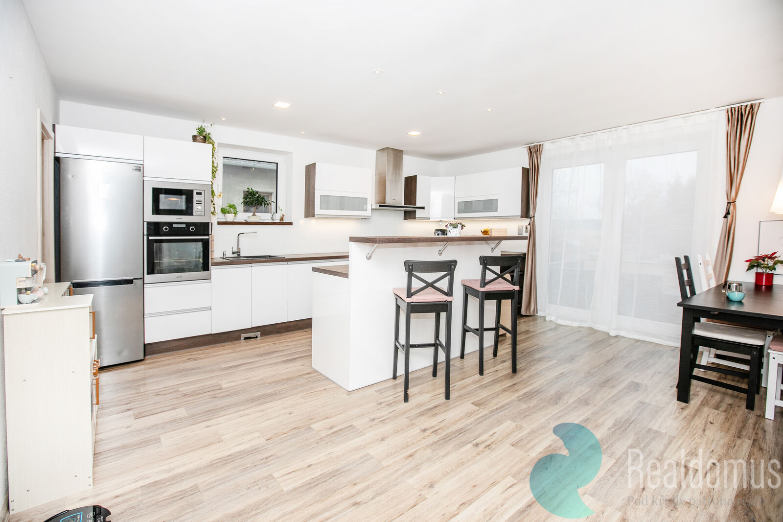 Hned po vstupu do zádveří odložíte kabáty a boty a projdete do chodby s praktickým samostatným WC. Srdcem domu je světlý obývací pokoj s moderní, plně vybavenou kuchyní, kde se bude odehrávat většina rodinných chvil. V zimě doplní atmosféru krbová kamna, v létě si vychutnáte kávu nebo grilování na terase (35m²) s výhledem do rozlehlé zahrady. u terasy s markýzou na ovládání se nachází skalka s jezírkem.