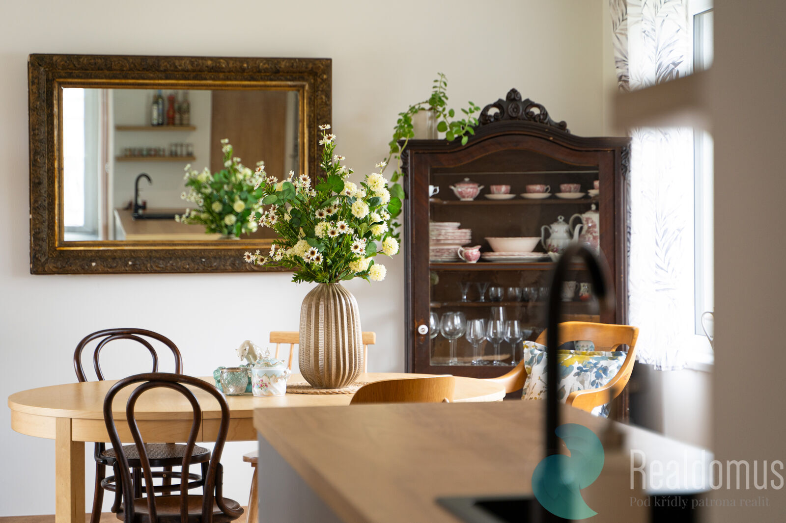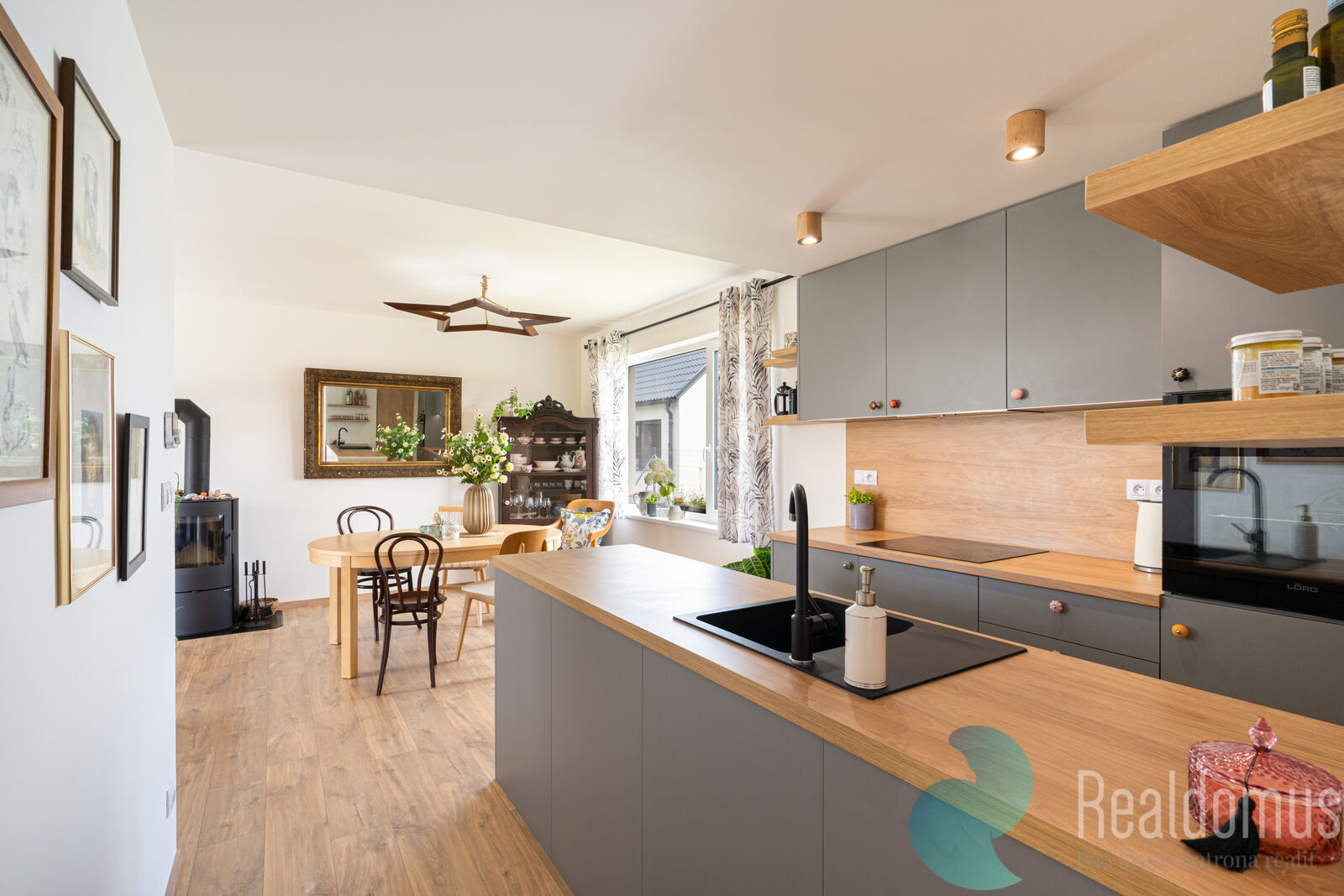 Interiér působí velmi vzdušně a svěže, nechybí moderní kuchyně ani stylová krbová kamna Romotop, která vytvářejí útulnou atmosféru. Kromě kamen zajišťuje vytápění také tepelné čerpadlo a v místnostech s dlažbou je podlahové topení. Díky izolačním trojsklům a kvalitnímu zateplení si dům drží nízkoenergetický standard a příjemné klima po celý rok.
