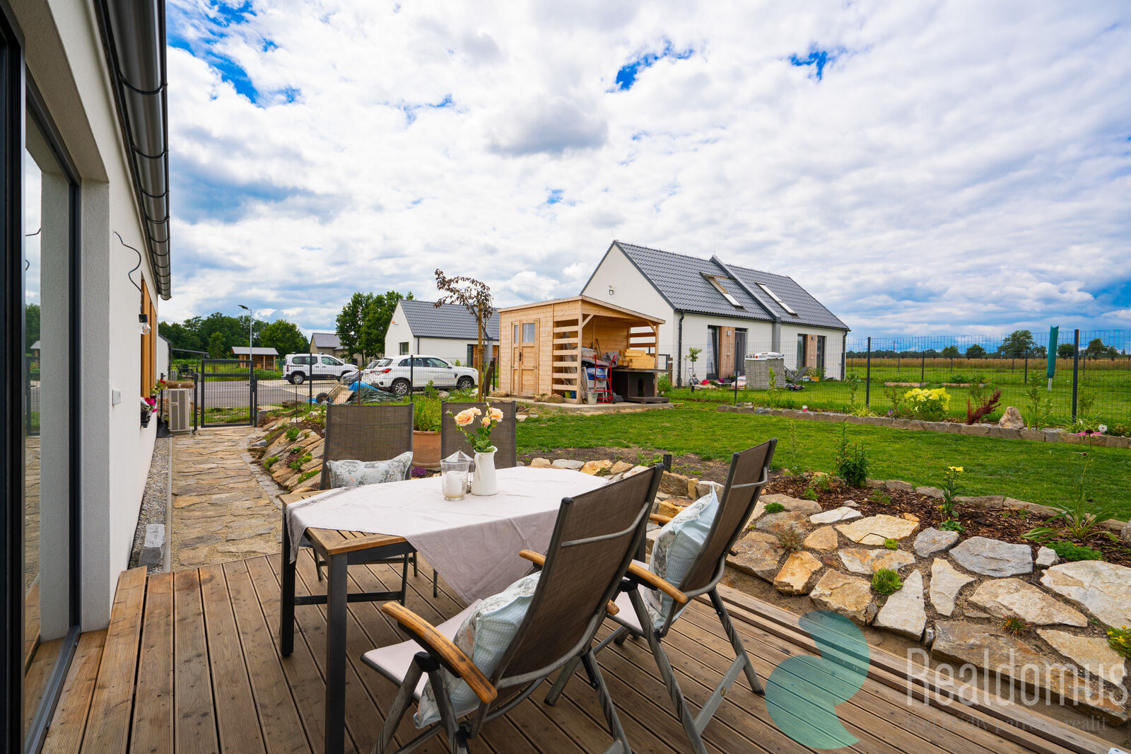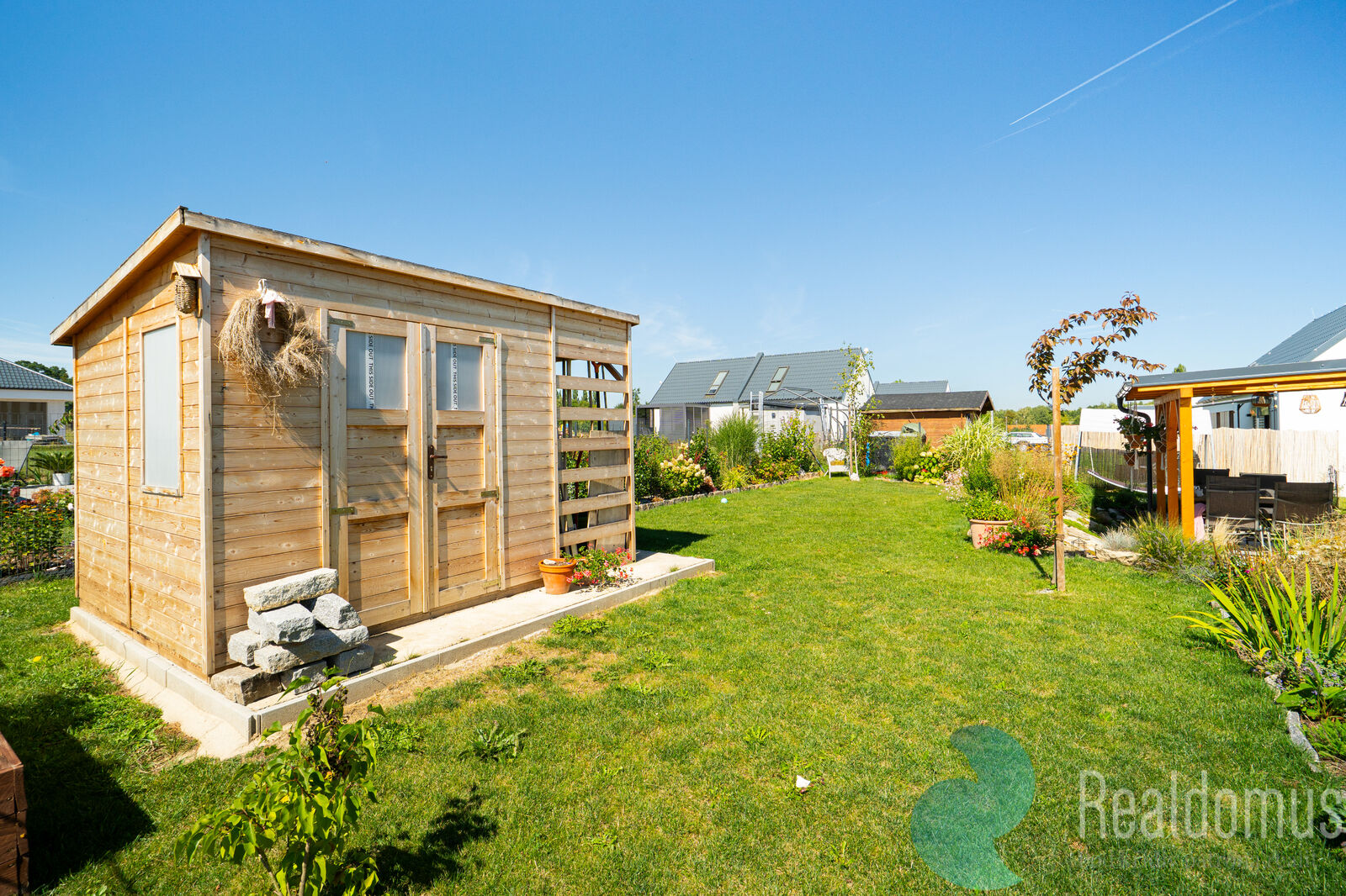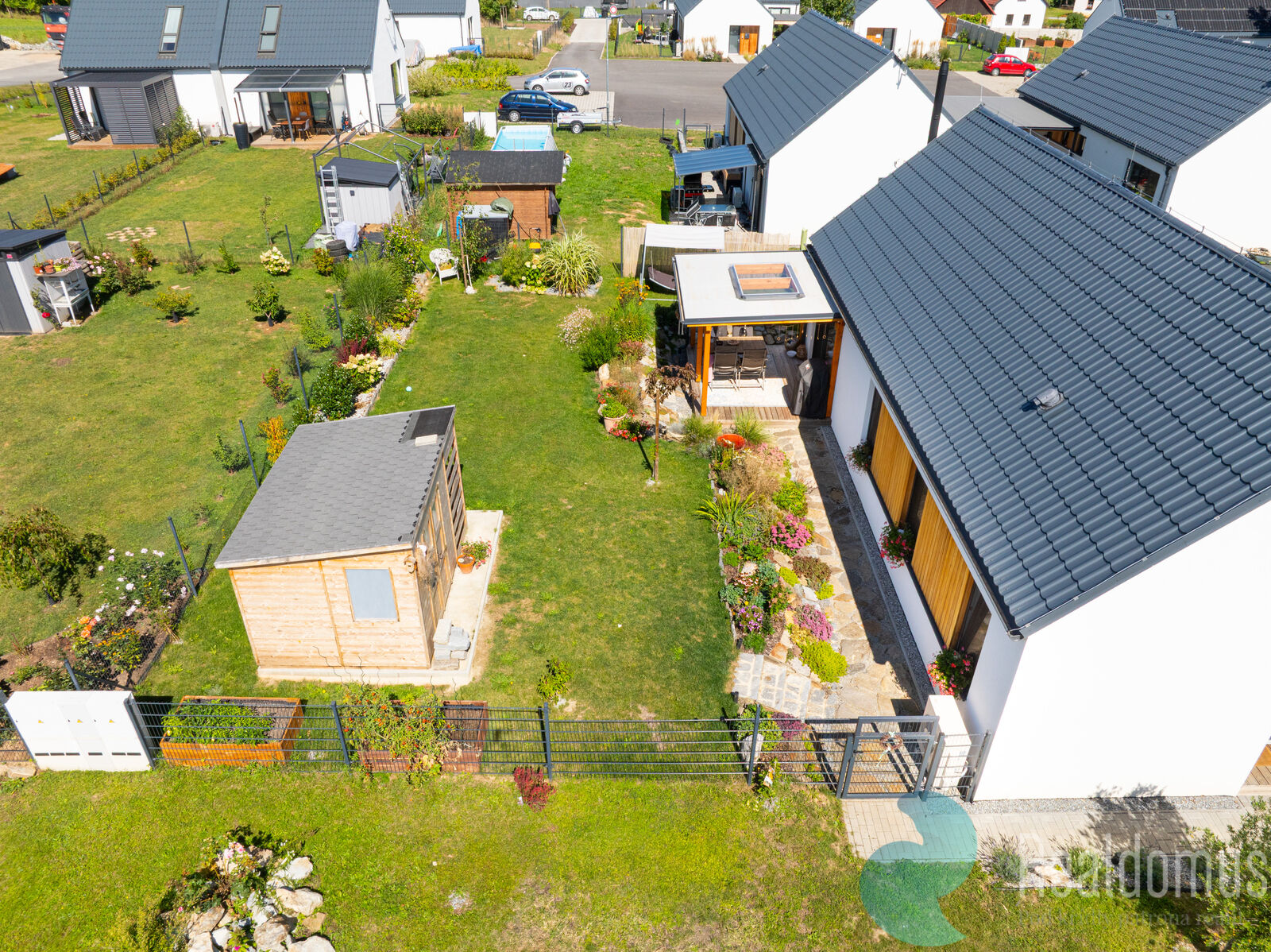 Na pečlivě upravené zahradě se nachází zahradní domek a prostorná krytá terasa s přímým vstupem z obývacího pokoje. Vše je dotaženo do detailu, takže nový majitel může dům ihned pohodlně obývat – bez dalších stavebních úprav či investic.