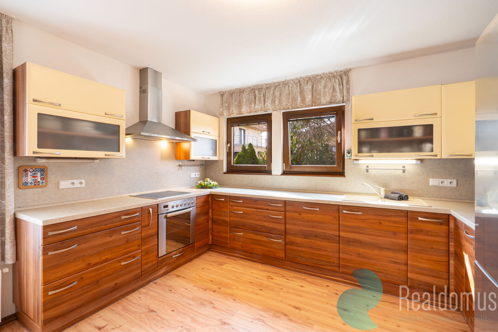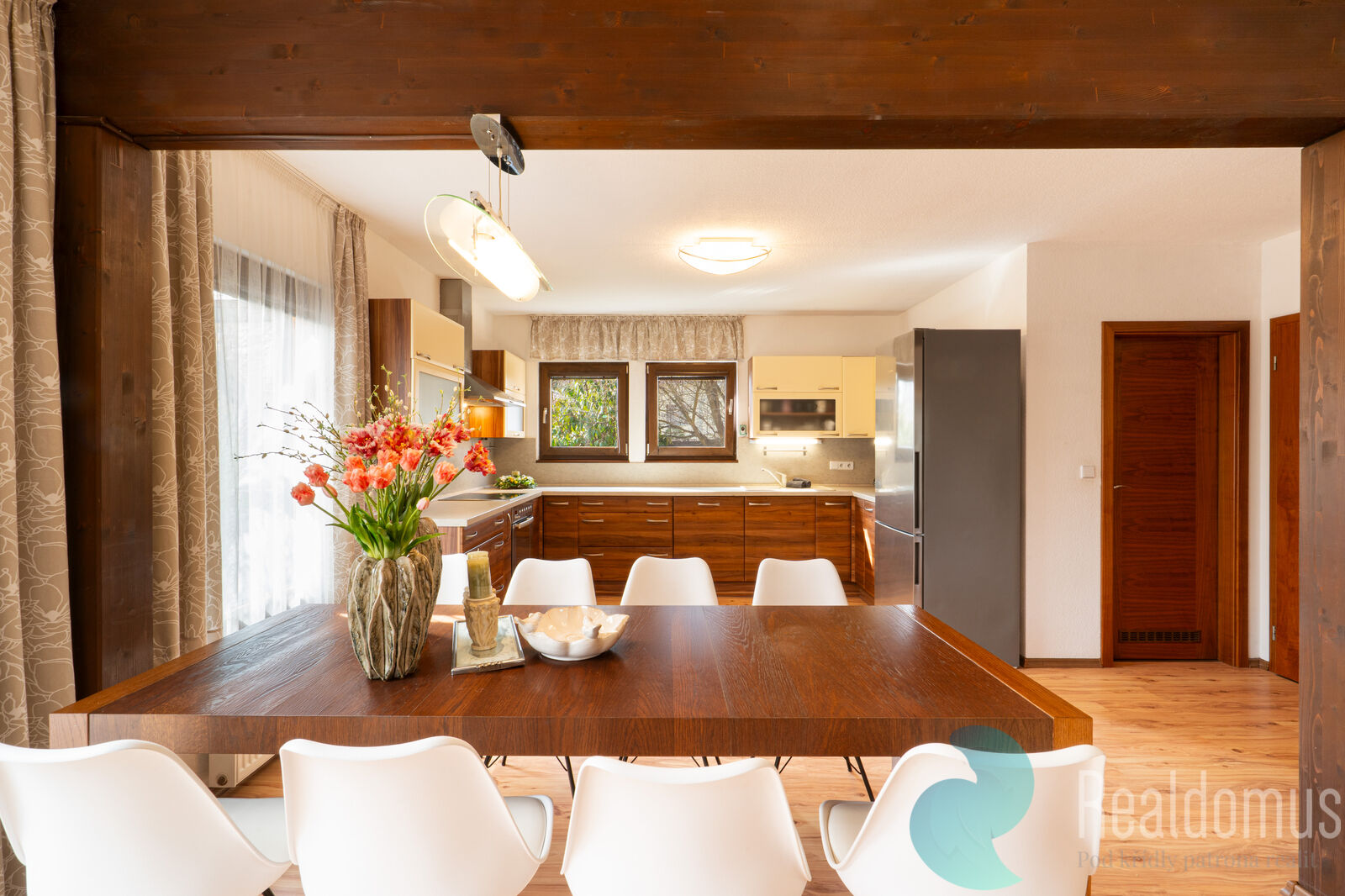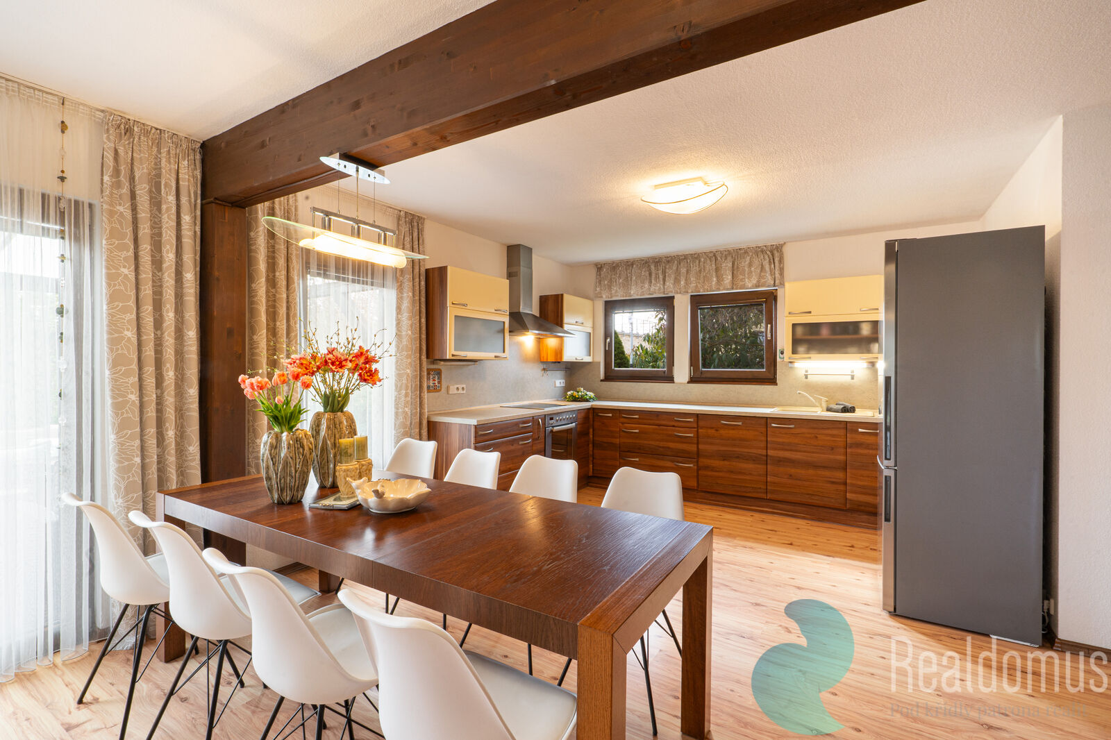 Dům o dispozici 5+kk je díky velkým oknům a přívětivé orientaci prosvětlený a vzdušný a nabízí dostatek prostoru i pro větší rodinu. V přízemí se nachází hlavní obytný prostor, který tvoří spojení prostorné kuchyně (17,70 m²), haly s jídelnou (16,07 m²) a obývacího pokoje s kamny (17,03 m²). Dále zde najdeme pokoj/pracovnu 10,77 m², koupelnu s toaletou (3,01 m²), komoru 2,27 m² a zádveří (3,29 m²). Podkroví tvoří odpočinkovou část domu, je zde hala 11,08 m² a tři samostatné neprůchozí pokoje (13,29 m², 19,06 m², 20,12 m²), dále koupelna s vanou a sprchou (8,55 m²) a samostatné WC (2,27 m²).