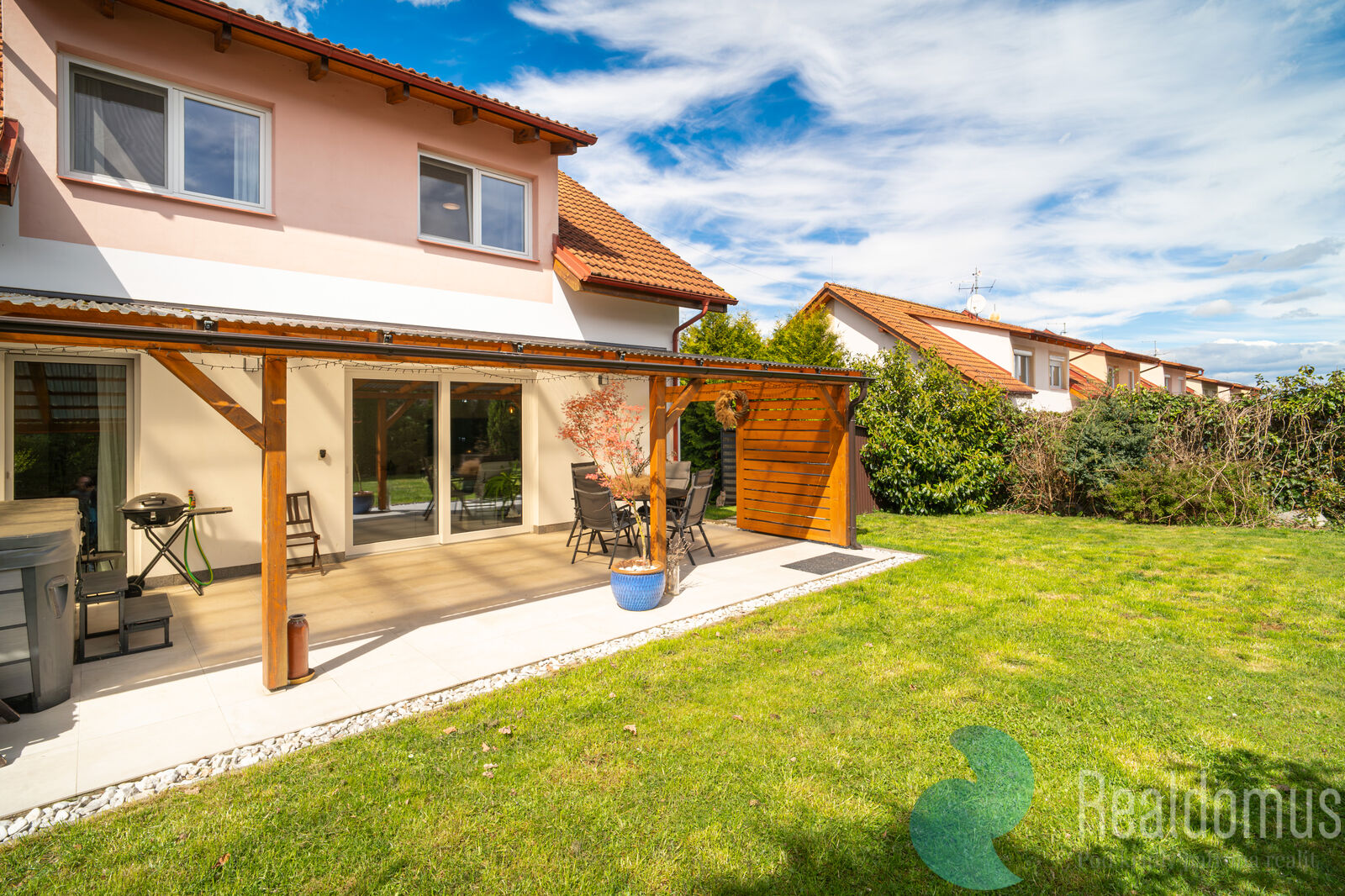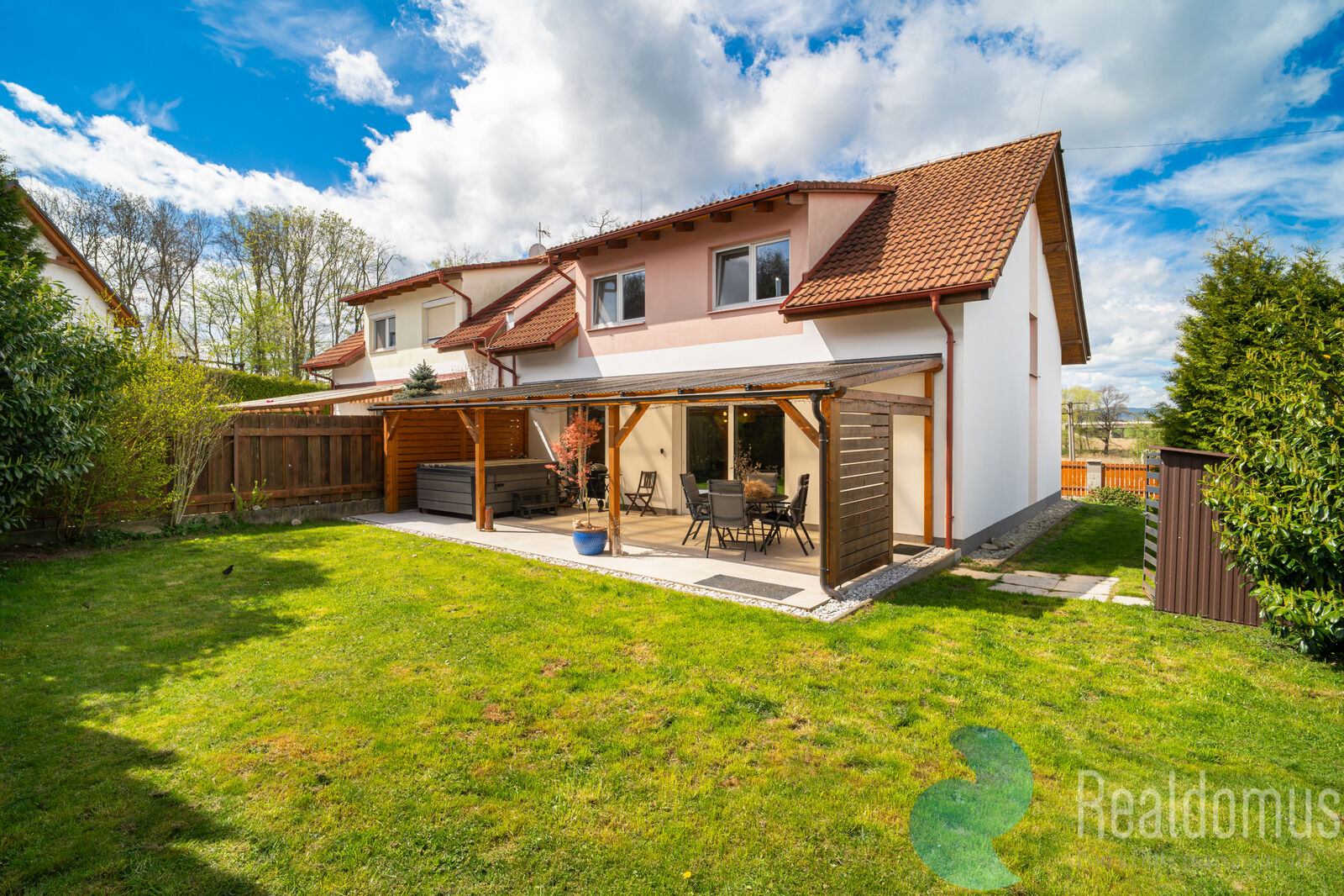 Srdcem domu je světlý obývací pokoj plynule propojený s kuchyní. Celý prostor působí velmi vzdušně a otevřeně a vytváří ideální místo pro rodinný život i setkávání s přáteli. Velké portálové dveře navazují na terasu se vstupem do zahrady, která nabízí příjemné soukromí a klid pro relaxaci. Součástí prodeje je také vířivka umístěná na terase, která ještě více podtrhuje komfort tohoto bydlení.