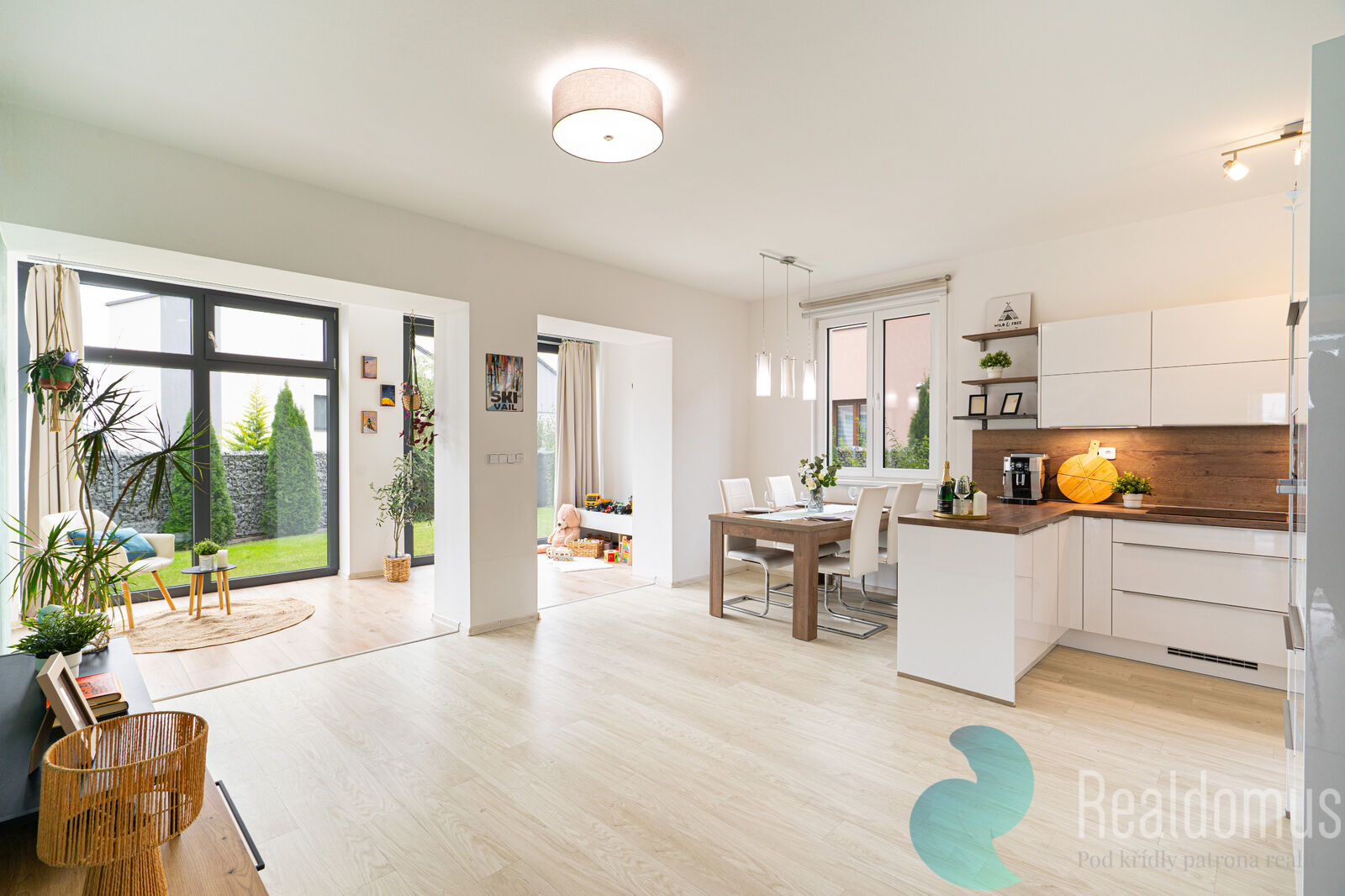 Přízemí: prostorný obývací pokoj s kuchyňským koutem, samostatný pokoj, technická místnost, komora, WC, zastřešená terasa a garáž.