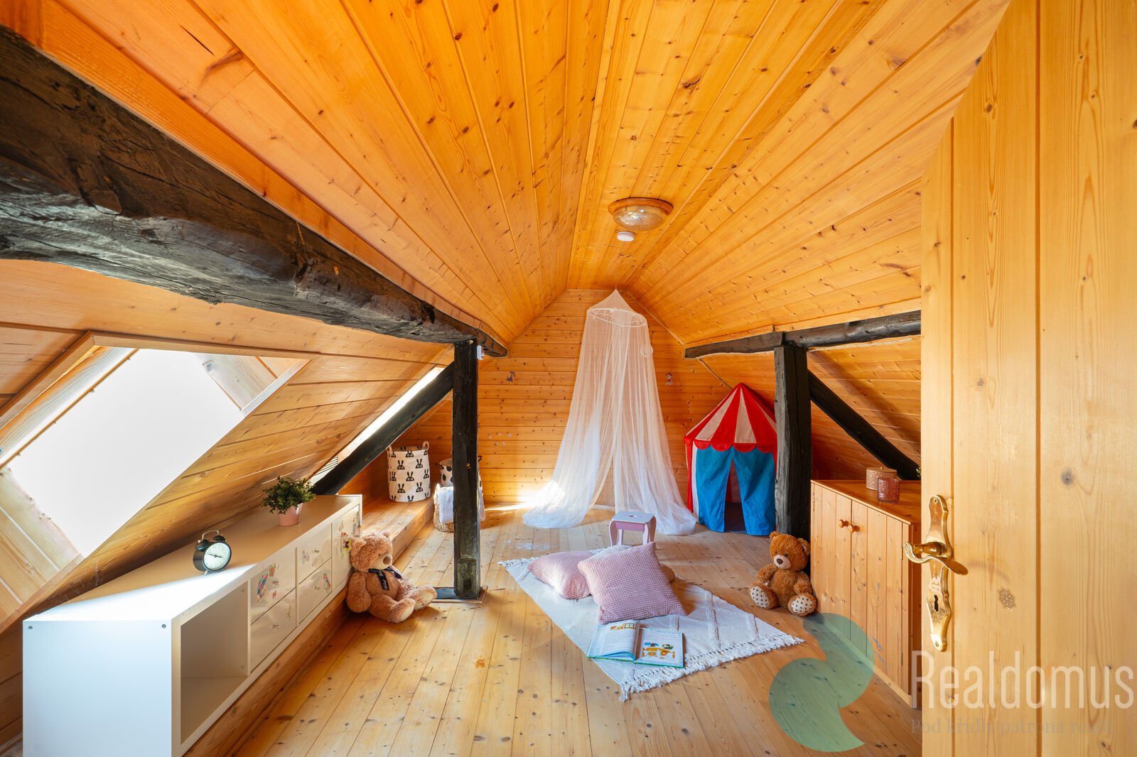 Dispozice domu je bohatě dimenzovaná i pro větší rodinu. Kromě velkého prostoru obýváku s jídelnou se zde nachází i prostorná kuchyně, 2 dětské pokoje, ložnice, herna a pokoj sloužící jako čítárna/odpočívárna.