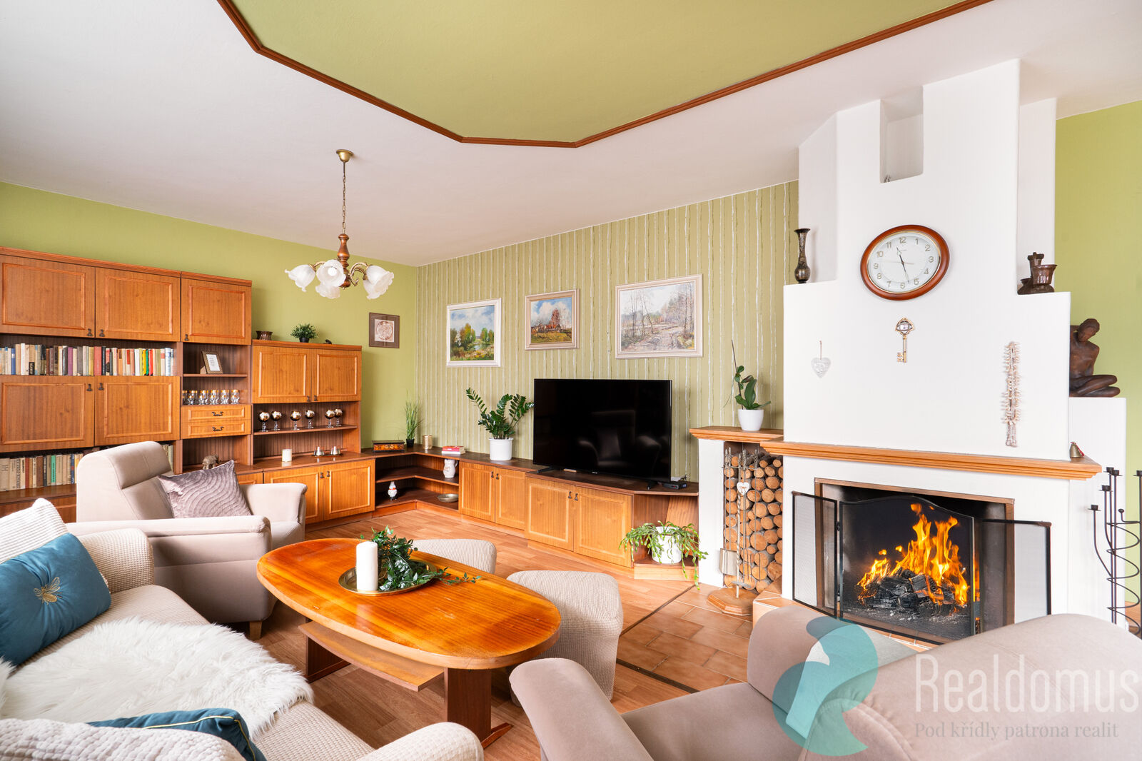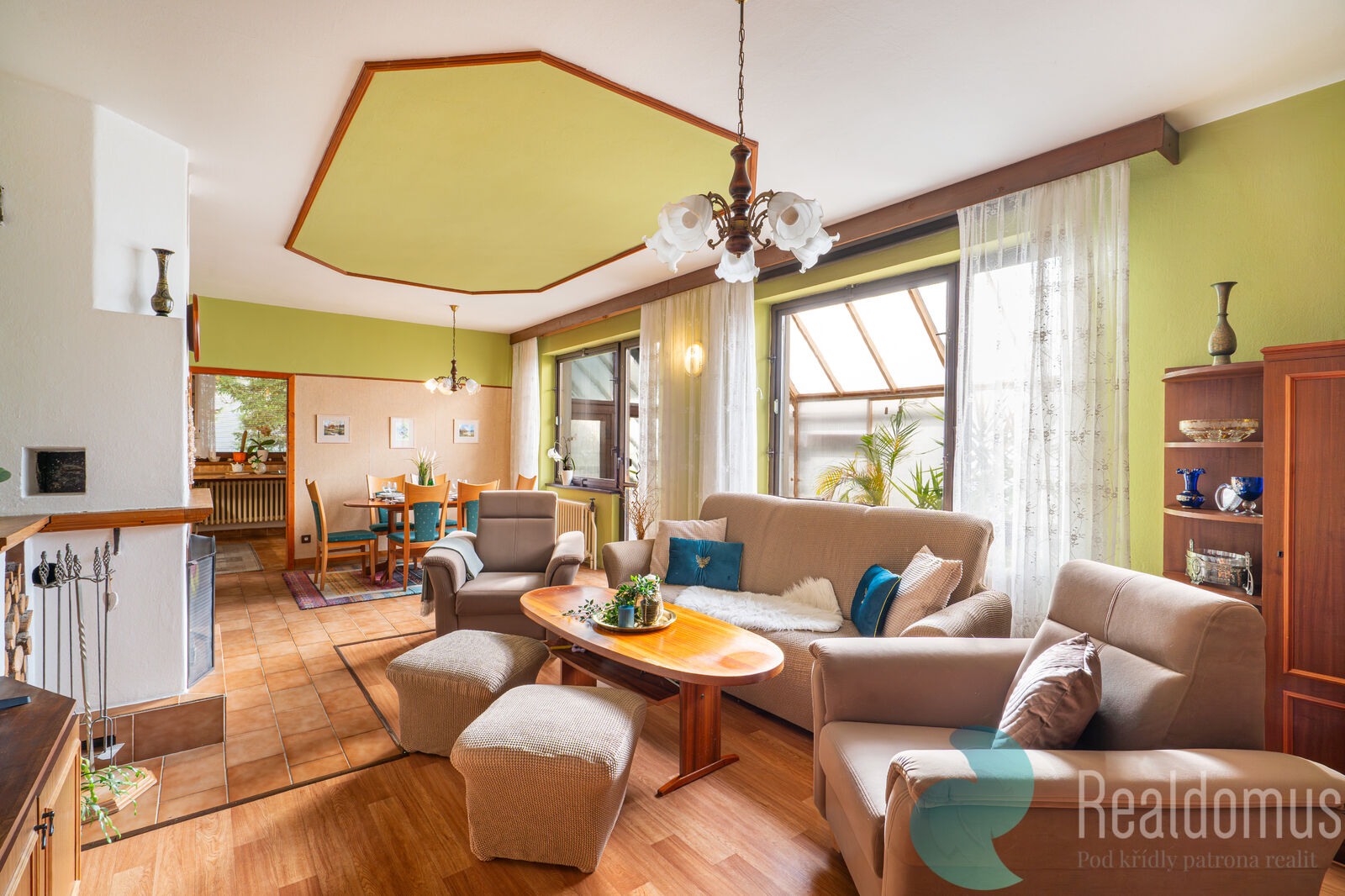 Prostorný obývací pokoj s krbem a jídelní částí působí velmi vzdušně a je krásně prosvětlený díky velkým oknům a dveřím vedoucím na zimní terasu, která je ideálním místem pro letní posezení s přáteli i klidný odpočinek s knihou. Z tohoto prostoru je zajištěn pohodlný přístup jak na zahradu, tak i do krytého bazénu.