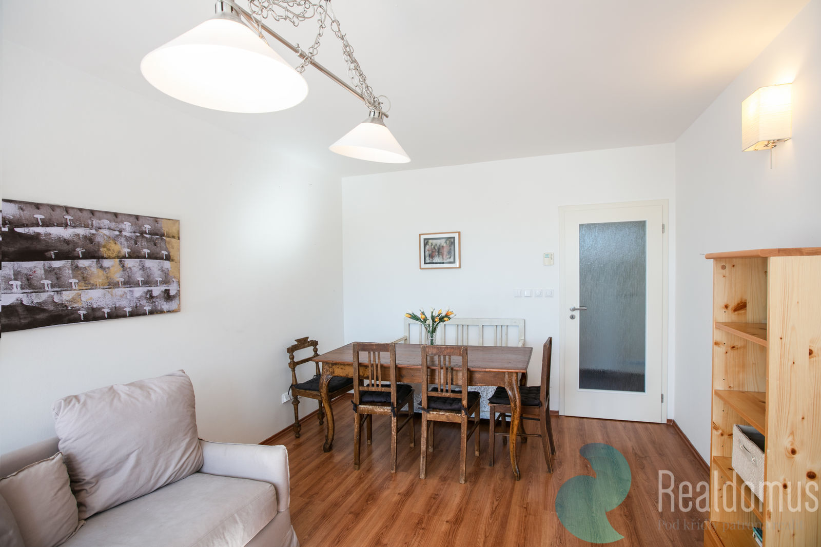 Obývací pokoj s pohovkou a jídelním stolem láká k večernímu posezení s rodinou či přáteli.
