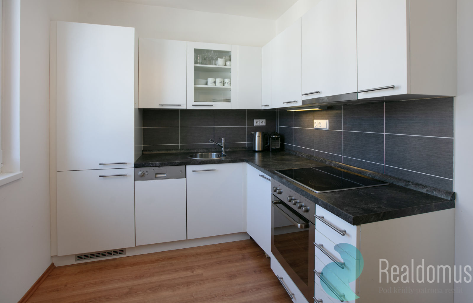 Kuchyně je světlá, praktická a plně vybavená moderními spotřebiči.