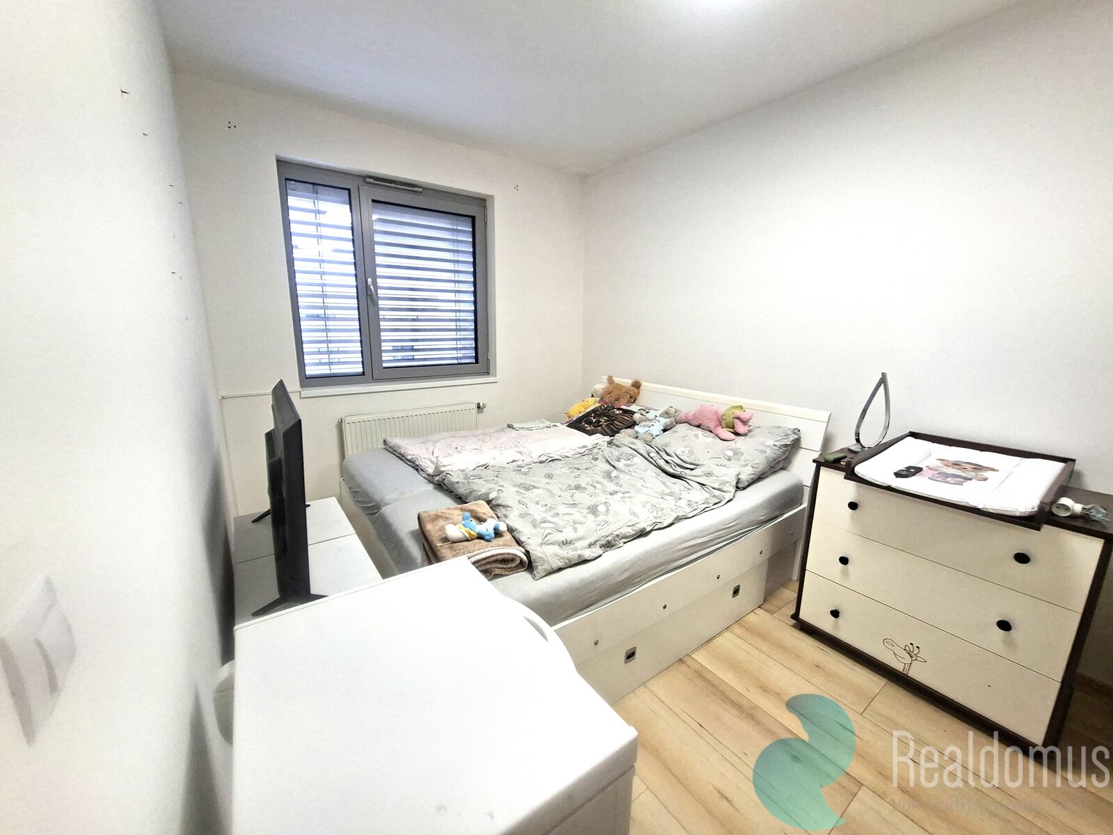 Dispozice bytu zahrnuje vstupní chodbu s praktickou vestavěnou skříní, obývací pokoj se vstupem na prostorný balkon, sedací soupravou a TV stěnou. Moderní kuchyňský kout je plně vybaven – lednice, myčka nádobí, mikrovlnná trouba, indukční varná deska a jídelní stůl se židlemi.