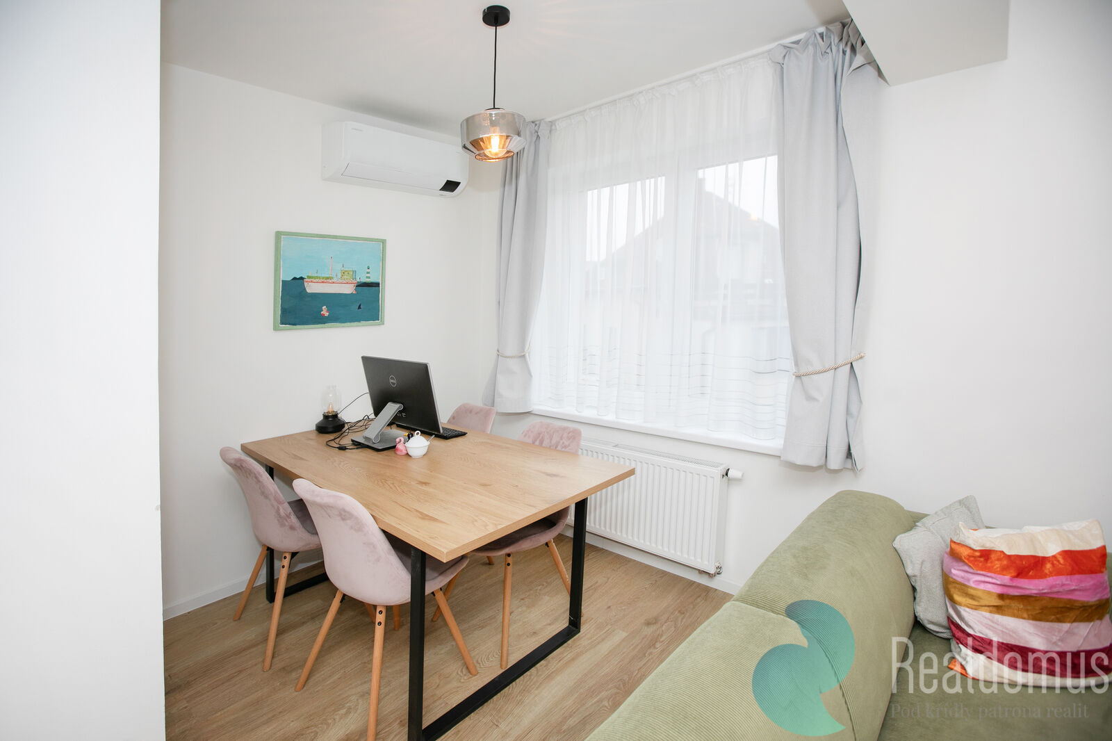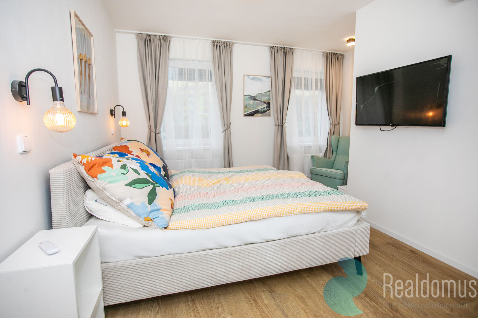Interiér bytu zcela modernizován a nabízí příjemné zázemí pro bydlení. Vstup do bytu je po schodech. Chodbou se vchází do ložnice (14,7 m2) s vestavnými skříněmi a klimatizací. Obývací pokoj (24 m²) je vybaven plně zařízeným kuchyňským koutem obsahujícím lednici, myčku, varnou desku a troubu. Je zde i dostatečný prostor pro jídelní stůl. Vedle kuchyně se ukrývá komora na potraviny a jiné předměty.