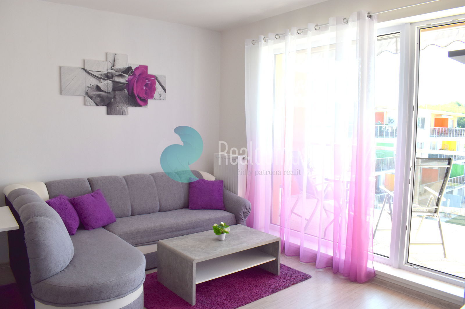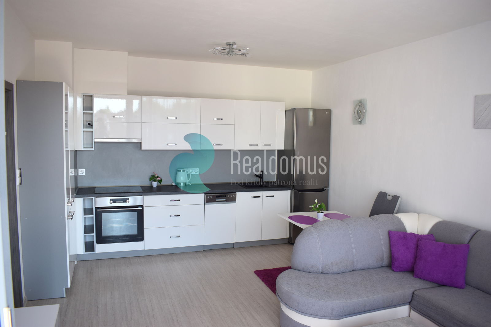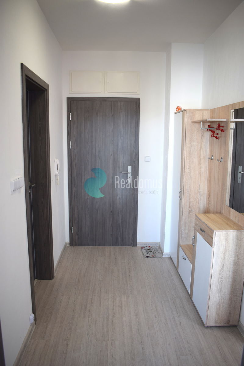 Dispozice bytové jednotky : zádveří, obývací pokoj s kuchyňským koutem se vstupem na terasu ( 8 m2) opatřenou markýzou na dálkové ovládání , dále ložnice a koupelna s toaletou. Byt je pronajímán včetně vybavení, dle přiložených fotografií. Kuchyňská linka vybavena : lednice s mrazákem, indukční varná deska s el. troubou, digestoř.