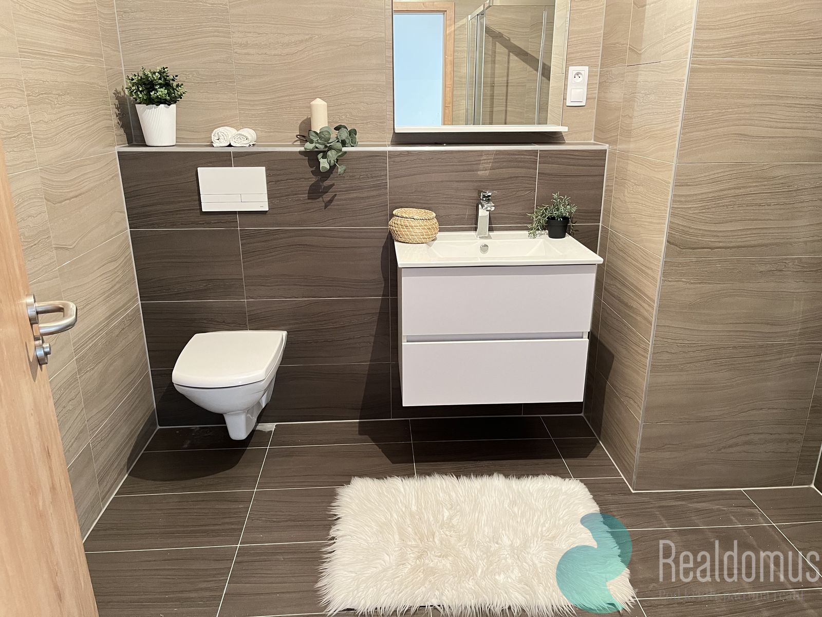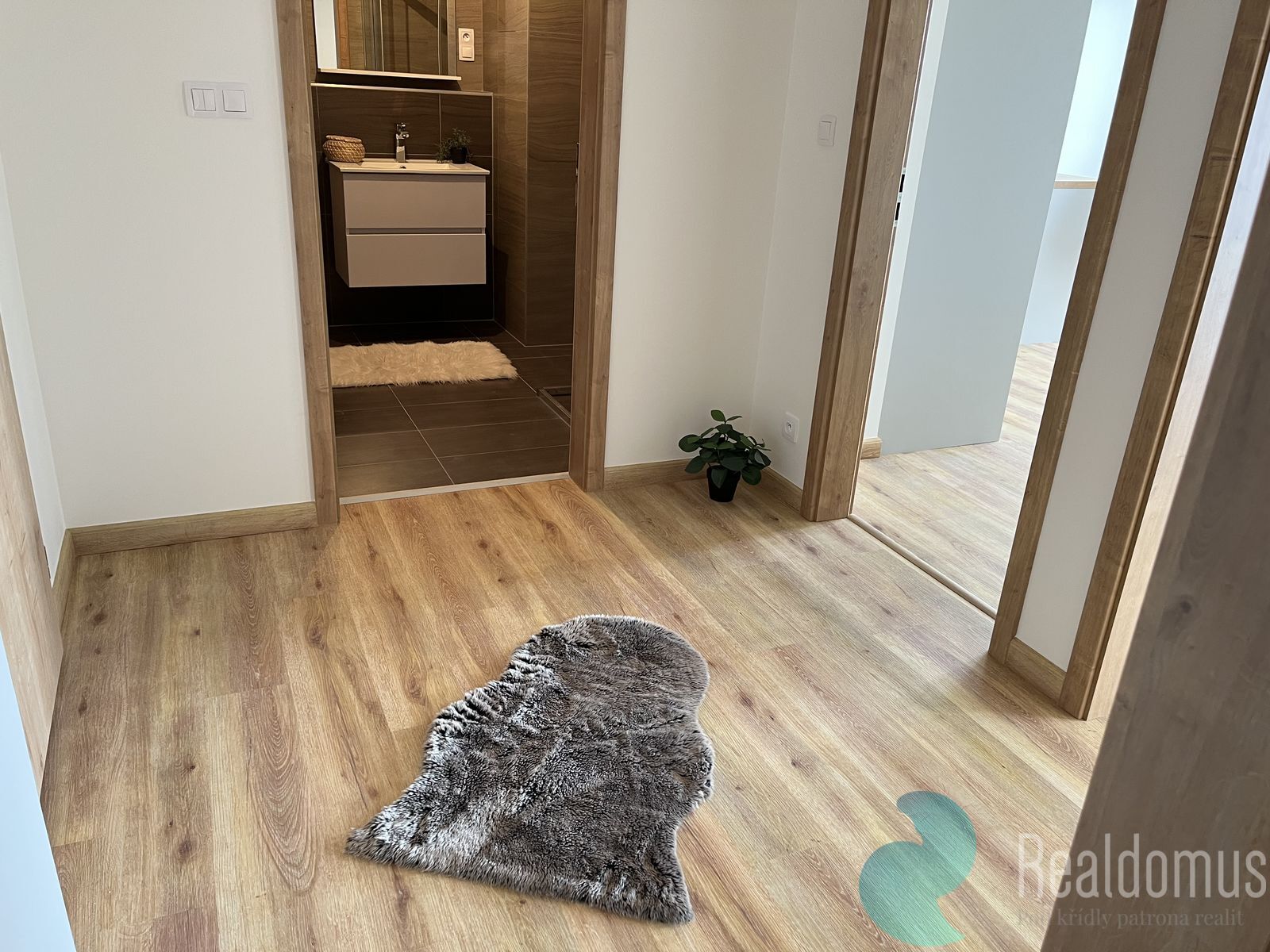 Dispozice: zádveří, kuchyně spojená s obývacím prostorem, ložnice, šatna, koupelna se sprchovým koutem a závěsné WC. Kuchyňská linka vybavena vestavěnou lednicí, varnou deskou, troubou, digestoří a myčkou. U bytu je k dispozici prostorná terasa, která je průchozí z kuchyně a také z ložnice. Dále zděný sklep a vnitřní parkovací stání.