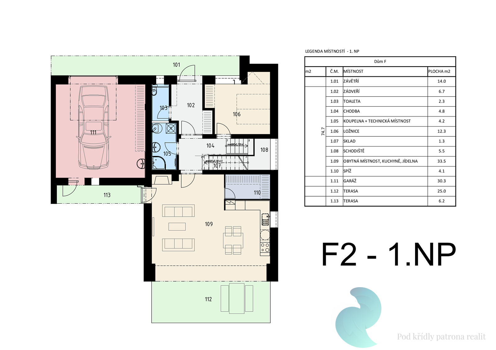 Dispozice 5+kk, terasa 25 m2 a 6,2 m2, garáž 30,3 m2 a pozemek 536 m²