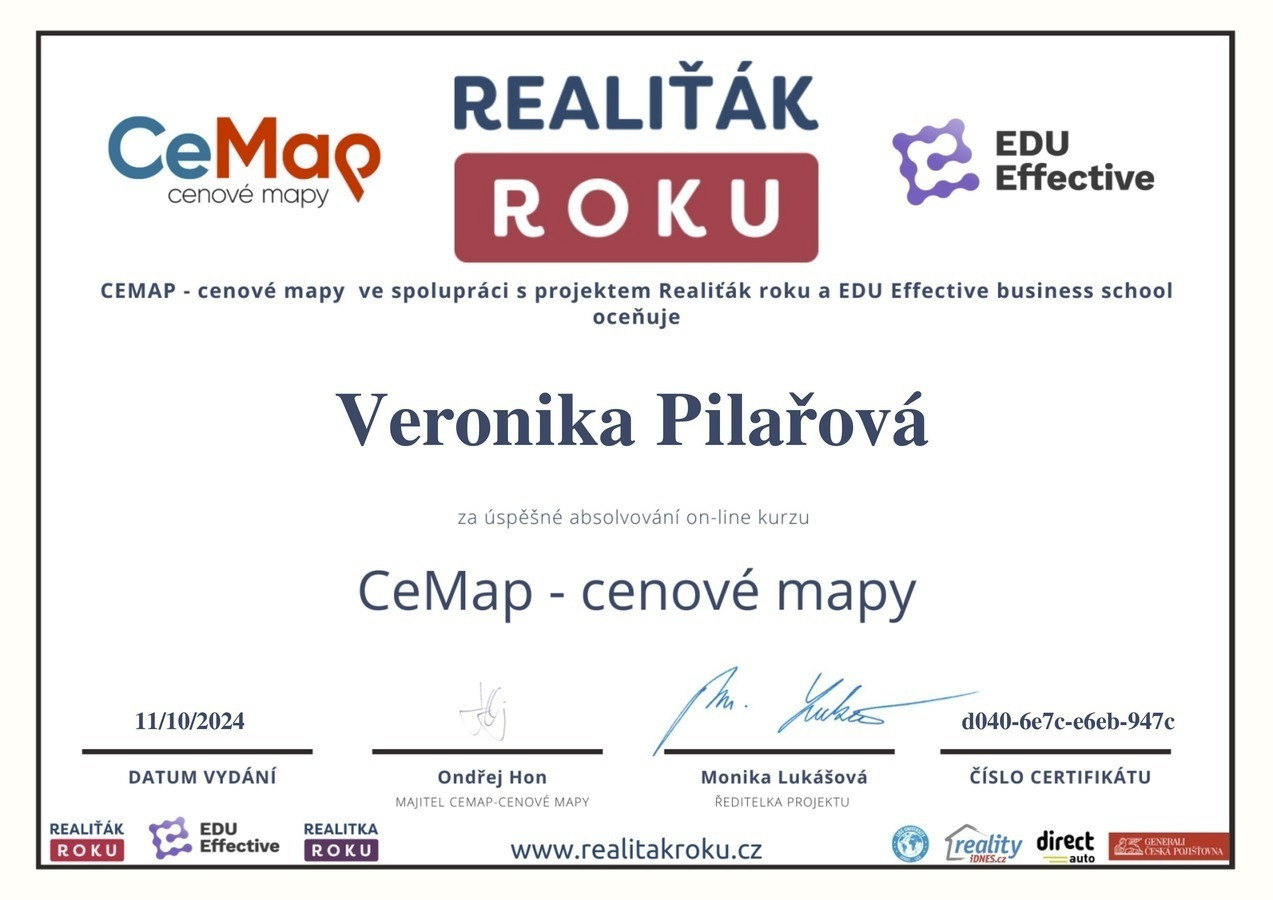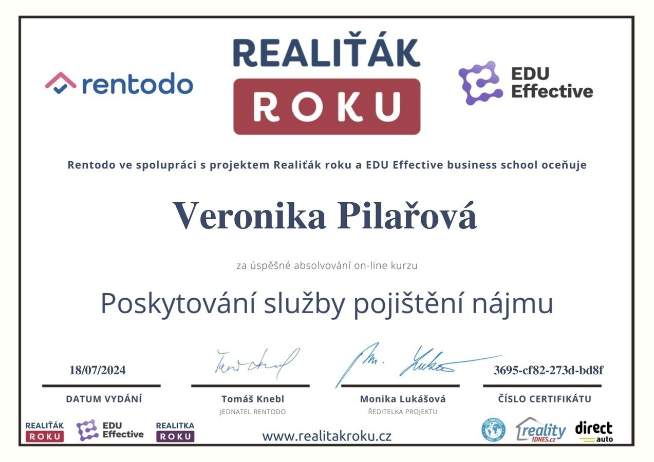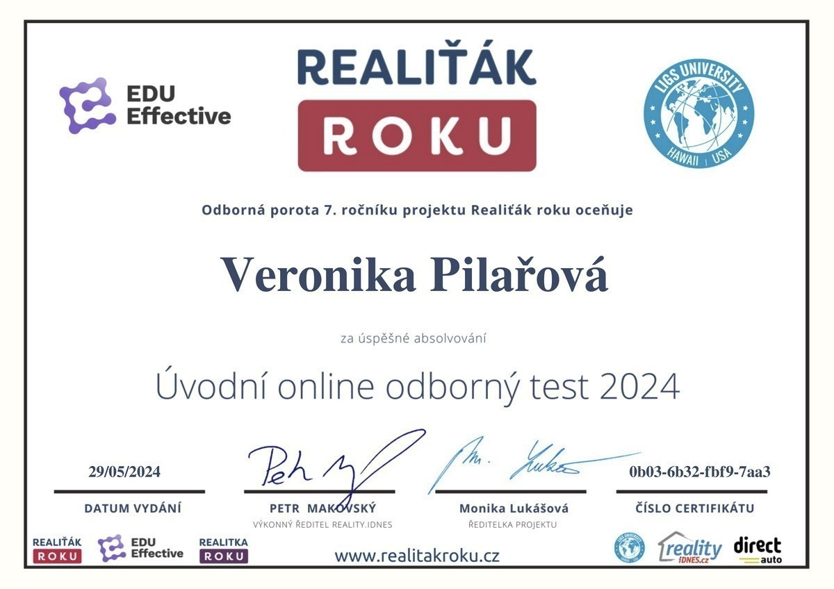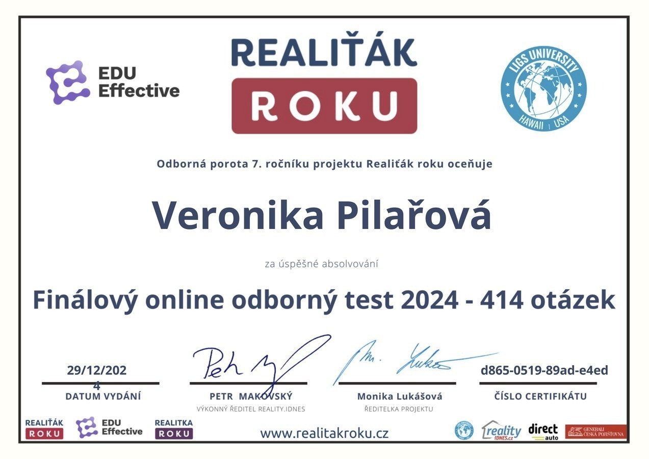 Chtěl bych touto cestou vyjádřit velké poděkování a spokojenost s prací paní Veroniky Pilařové. Prodej mé nemovitosti proběhl díky jejímu profesionálnímu přístupu naprosto hladce a bez stresu. Od prvního setkání byla velmi vstřícná a ochotná a vždy připravená. Oceňuji zejména její komunikaci, vždy mě o všem průběžně informovala. Pomohla nejen s kompletní prezentací nemovitosti, ale i s právními a administrativními kroky, což pro mě bylo obrovskou úlevou. Pokud hledáte realitního makléře, na kterého se můžete spolehnout, paní Veroniku Pilařovou mohu vřele doporučit.