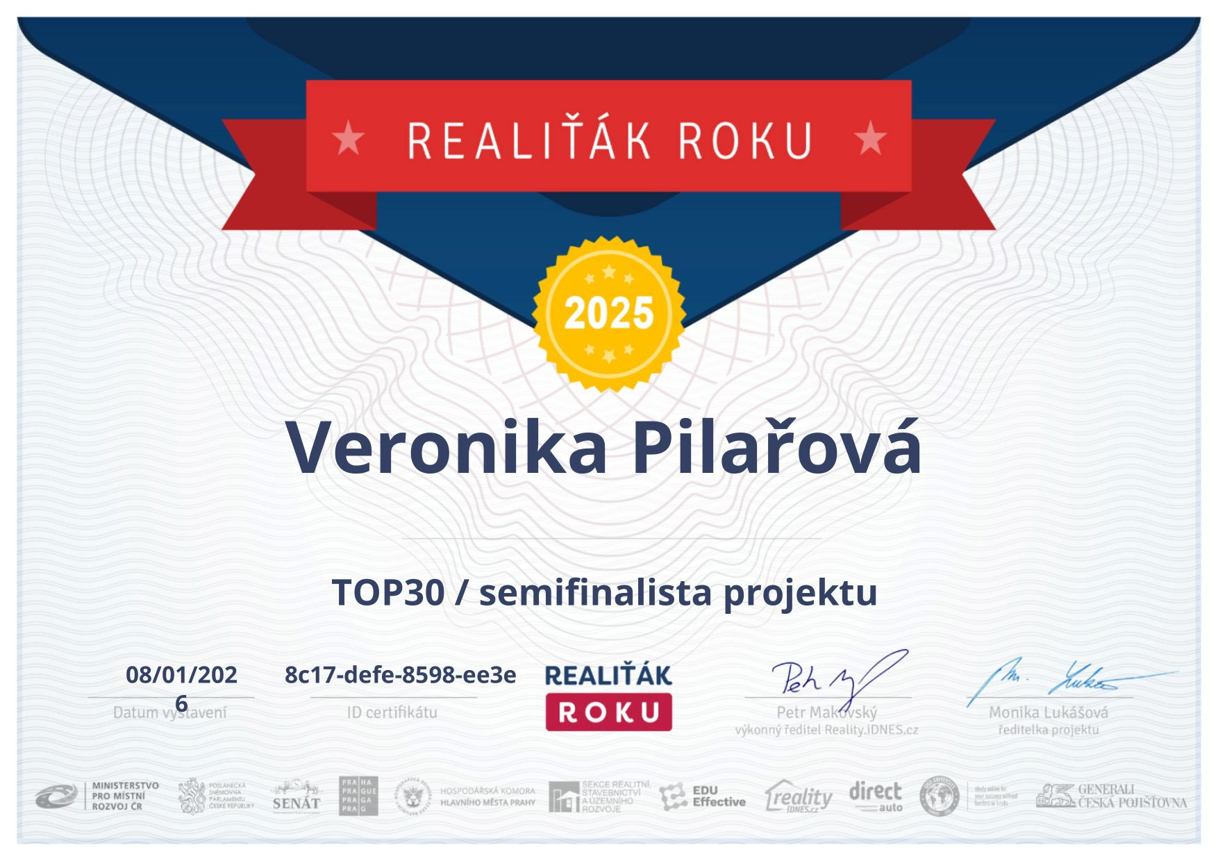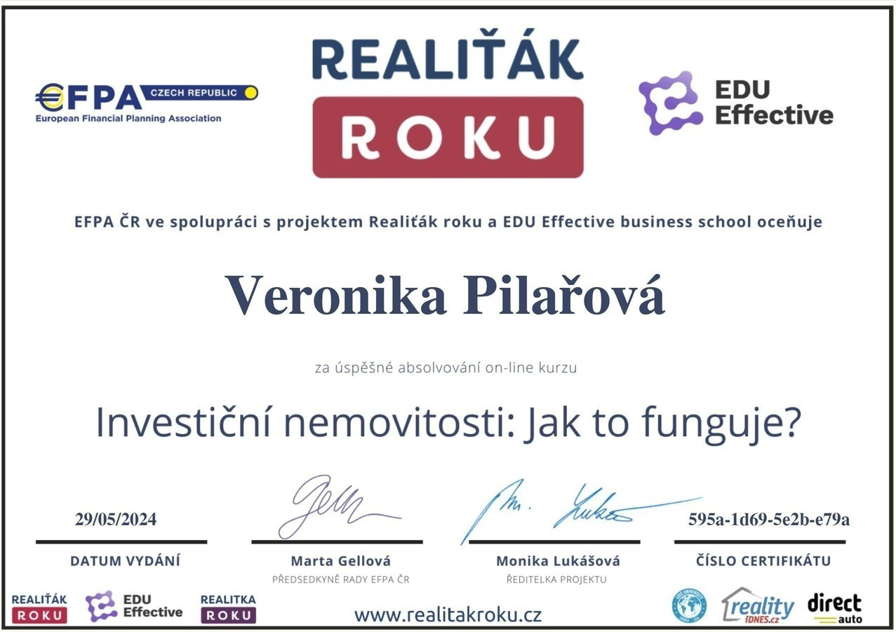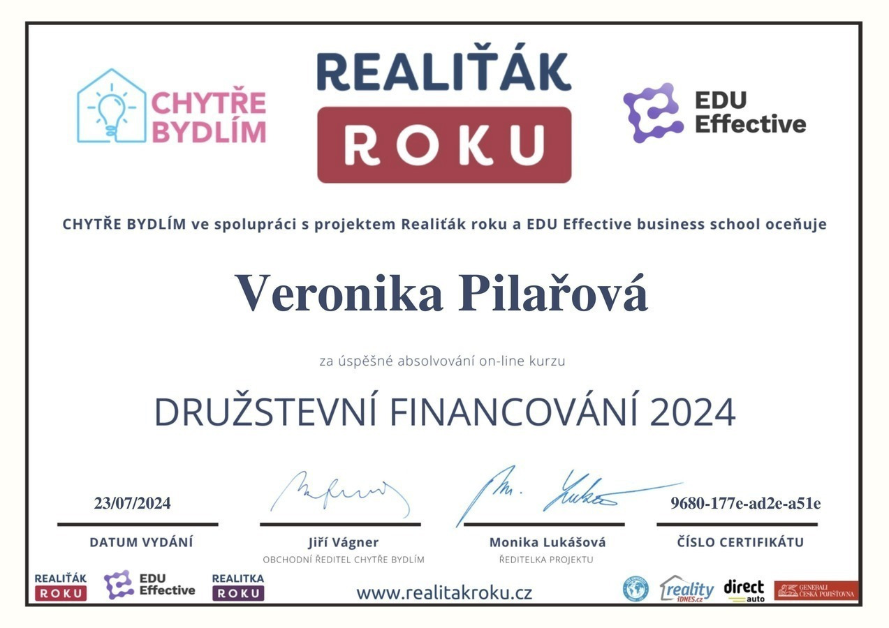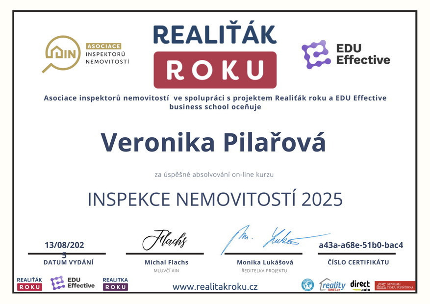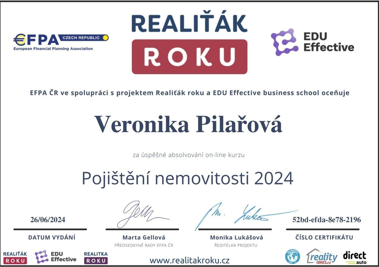 Chtěl bych touto cestou vyjádřit velké poděkování a spokojenost s prací paní Veroniky Pilařové. Prodej mé nemovitosti proběhl díky jejímu profesionálnímu přístupu naprosto hladce a bez stresu. Od prvního setkání byla velmi vstřícná a ochotná a vždy připravená. Oceňuji zejména její komunikaci, vždy mě o všem průběžně informovala. Pomohla nejen s kompletní prezentací nemovitosti, ale i s právními a administrativními kroky, což pro mě bylo obrovskou úlevou. Pokud hledáte realitního makléře, na kterého se můžete spolehnout, paní Veroniku Pilařovou mohu vřele doporučit.