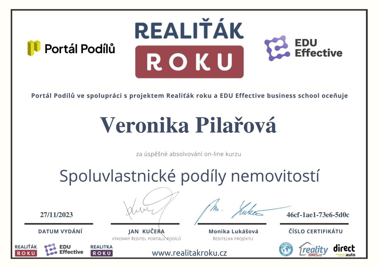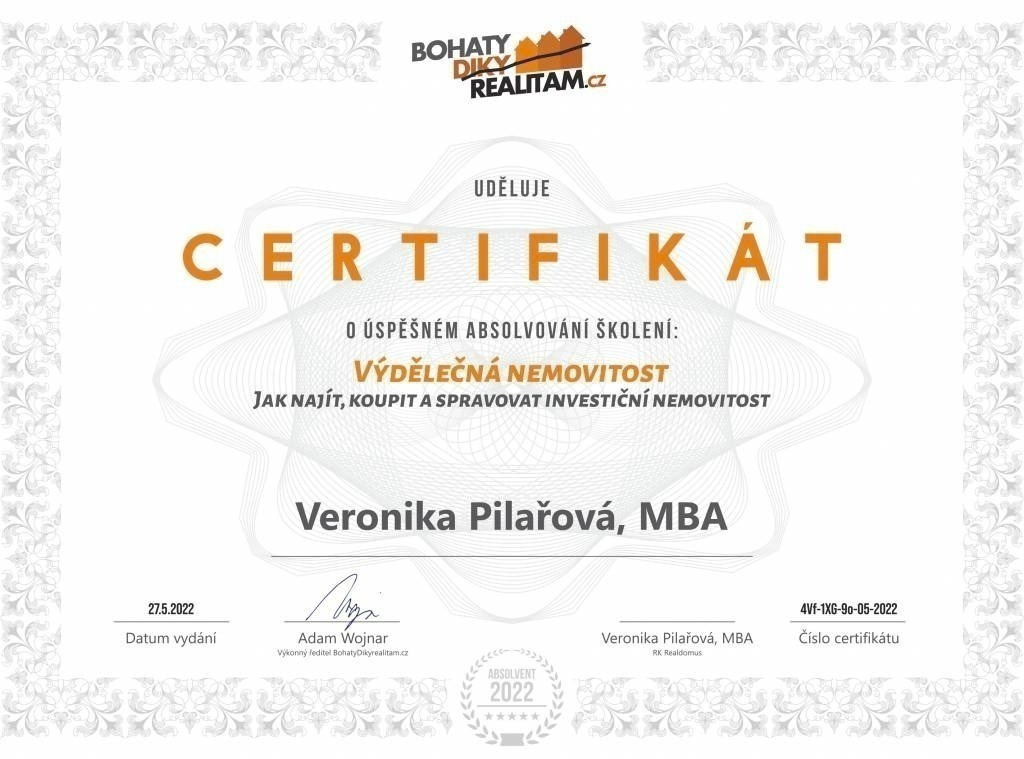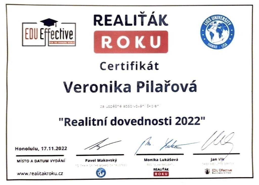 Ráda bych tímto poděkovala paní Veronice Pilařové za spolupráci při správě našich realit, tentokrát již počtvrté. Vyzkoušely jsme si spolu prodeje i pronájmy a já už delší dobu vím, že Veroniku mohu s jistotou nejen sama oslovovat, ale i na 100 % doporučovat svým známým. Zažily jsme spolu mnoho různých situací, které bylo třeba řešit operativně, a vždy se nám to efektivně povedlo. Veronika nemá problém být online a pohotově řešit nastalé situace odkudkoliv. Nevím, jak to dělá, ale umí najít ty správné lidi, kteří jsou následně s celou transakcí oboustranně velmi spokojeni. Přeji i nadále mnoho úspěšných obchodů!